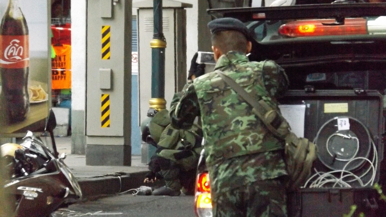 ตำรวจกลุ่มงานเก็บกู้และตรวจพิสูจน์วัตถุระเบิด บก.สปพ.หรืออีโอดี สวมชุดปอมสูทเข้าตรวจวัตถุต้องสงสัยที่มีมือดีนำมาวางป่วนใต้สถานีรถไฟฟ้าบีทีเอส นานา ปากซอยสุขุมวิท 7 ทำให้ประชาชนแตกตื่นหวาดกลัว แต่ตรวจพบเป็นแค่ลังใส่กระดาษ.