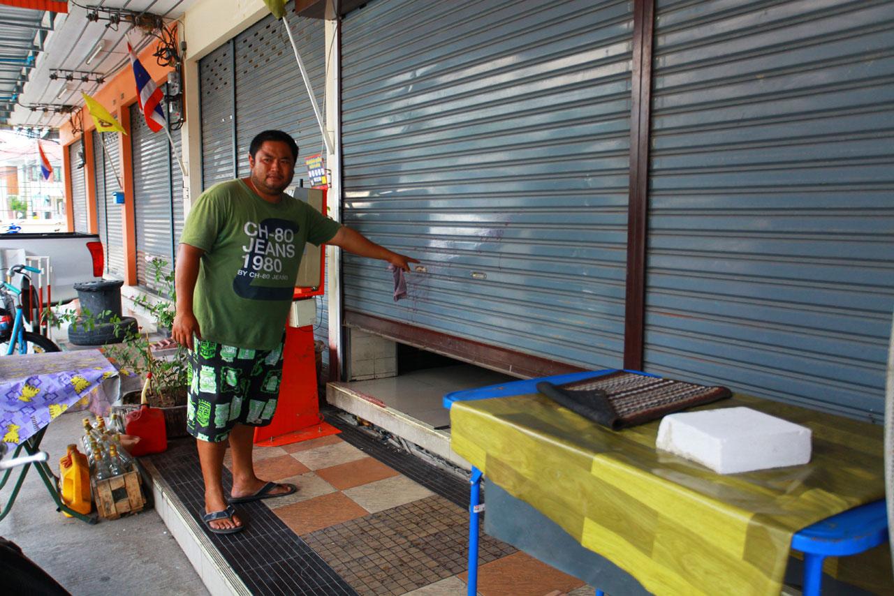 เมื่อเวลา 16.00 น. วันที่ 20 ส.ค. 58 นายอานนท์ สุขเจริญ อายุ 46 ปี พาผู้สื่อข่าวดูร่องรอยความเสียหายบริเวณประตูเหล็กม้วนหน้าอาคารพาณิชย์ เลขที่ 959/79 หมู่บ้านทรัพย์รุ่งเรืองซิตี้ หมู่ 5 ถนนสุขุมวิท ต.ท้ายบ้าน อ.เมือง จ.สมุทรปราการ และด้านล่างเป็นร้านขายของ หลังถูกชายฉกรรจ์ซึ่งเป็นแก๊งทวงเงินกู้นอกระบบ จำนวน 2 คน ขี่รถจักรยานยนต์เข้ามาจอดหน้าบ้าน ก่อนคนซ้อนท้ายจะลงมาใช้เท้าถีบประตู และหยิบขวดแก้วเขวี้ยงใส่ประตูจนได้รับความเสียหาย โดยกล้องวงจรปิดได้บันทึกพฤติกรรมของแก๊งทวงเงินกู้รายนี้ได้ทั้งหมด เหตุเกิดเมื่อช่วงเวลา 20.40 น. ของวันที่ 19 ส.ค.ที่ผ่านมา ตรวจสอบที่เกิดเหตุ พบบริเวณประตูมีรอยบุบเสียหาย และมีของเสียหายจำนวนหนึ่ง