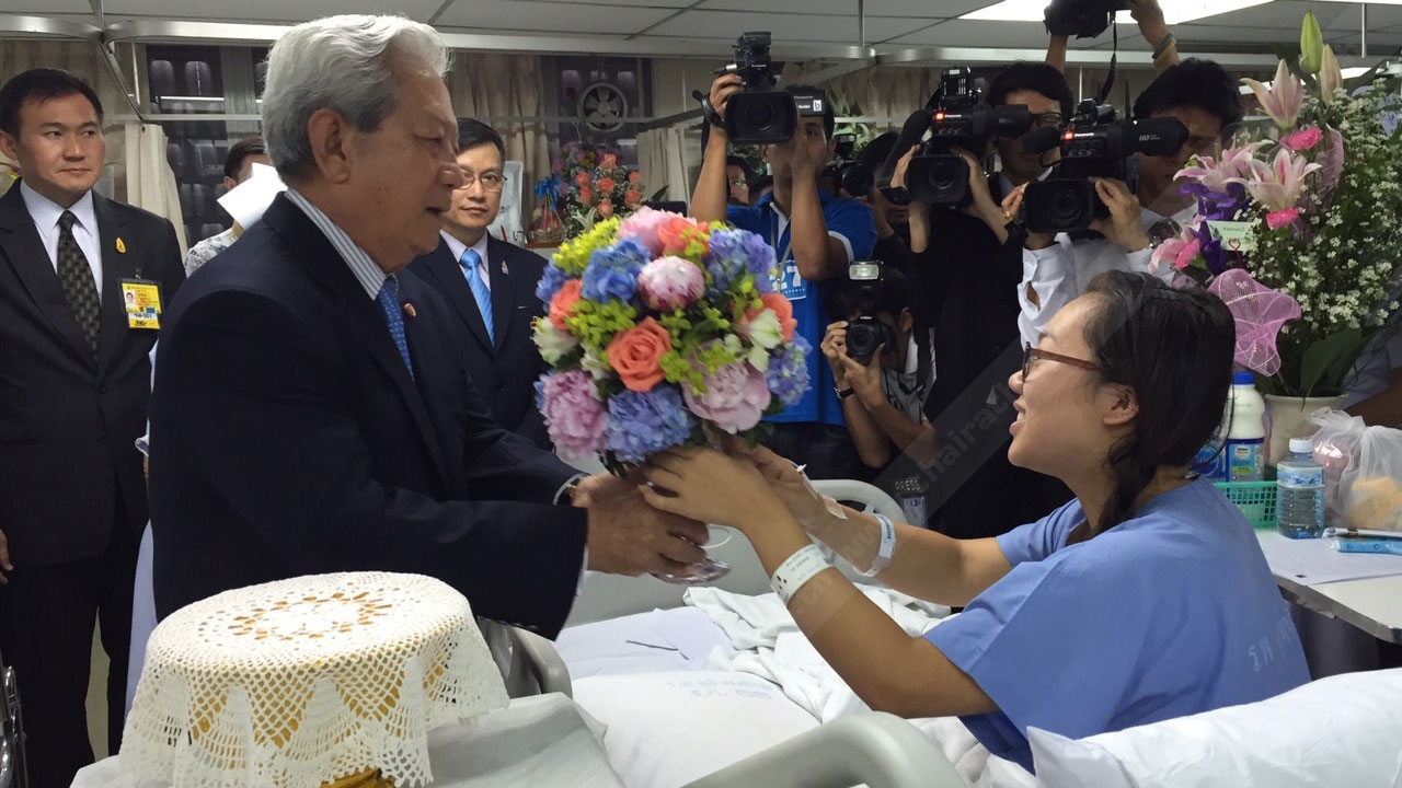 พระบาทสมเด็จพระเจ้าอยู่หัว และสมเด็จพระนางเจ้าฯ พระบรมราชินีนาถ ทรงพระกรุณาโปรดเกล้าโปรดกระหม่อมให้ องคมนตรี เชิญดอกไม้พระราชทานไปมอบแก่ผู้ได้รับบาดเจ็บจากเหตุระเบิดบริเวณสี่แยกราชประสงค์ที่โรงพยาบาล...
