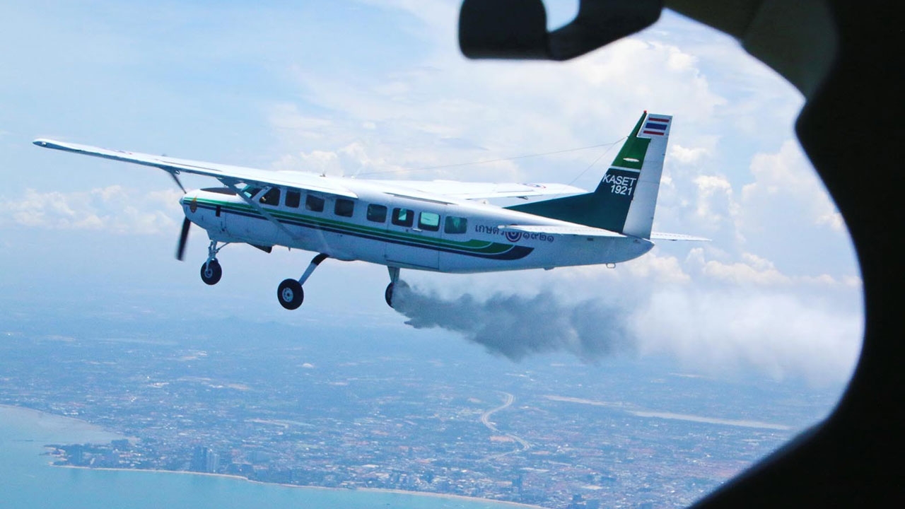 จากนั้น ผู้ว่าราชการจังหวัดชลบุรี พร้อมคณะ ได้เดินทางเข้าร่วมในภารกิจปฏิบัติการทำฝนหลวง โดยเครื่องบินทำฝนหลวงแบบ เซสน่า แกรนด์ คาราวาน (Cessna Grand Caravan) หมายเลข 1921 และ 1914 บินขึ้นจากฝูงบิน ศูนย์ปฏิบัติการทำฝนหลวง โดยลำเลียงสารเคมี เกลือโซเดียมคลอไรด์ โปรยในอากาศเพื่อทำปฏิกิริยากับก้อนเมฆให้เกิดเป็นฝน ในระดับความสูงที่ 6,000 ฟิต ตลอดแนวชายฝั่งจังหวัดชลบุรี