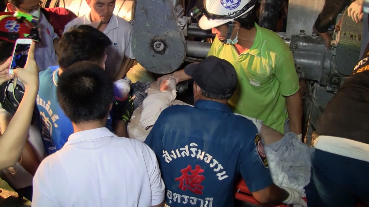 หนุ่มช่างเมืองอุดรฯ พลัดตกเครื่องสลัดแป้ง ถูกบดมือแหลกสุดหวาดเสียว คาดต้องตัดทิ้ง กู้ภัยต้องใช้เครื่องตัดถ่างนานกว่าชม. จึงช่วยออกมาได้ ด้านตร.เร่งหาสาเหตุ