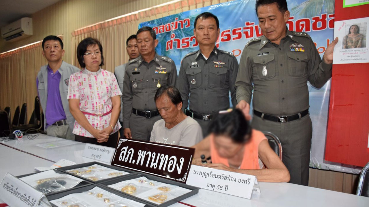 ตำรวจรวบแก๊งลักทรัพย์บ้านผู้จัดการธนาคารออมสินรายนี้ เปิดเผยขึ้นเมื่อเวลา 12.00 น. วันที่ 20 ส.ค. ที่ห้องประชุม บก.ภ.จ.ชลบุรี พล.ต.ต.กิตติพงษ์ เงามุข รอง ผบช.ภ.2 พร้อมด้วย พล.ต.ต.นิติพงศ์ เนียมน้อย ผบก.ภ.จ.ชลบุรี ร่วมแถลงผลจับกุมนางบุญเรือน ธงศรี อายุ 58 ปี อยู่บ้านเลขที่ 40/4 ม.5 แขวงคลองกุ่ม เขตบึงกุ่ม กทม. หัวหน้าแก๊งลักทรัพย์ และนายสมหมาย พงษ์ประยูร อายุ 46 ปี ลูกสมุน อยู่บ้านเลขที่ 49 ซอยรามคำแหง 4/1 แขวงหัวหมาก เขตบางกะปิ กทม. พร้อมของกลางรถปิกอัพโตโยต้าไมตี้เอ็กซ์ สีบรอนซ์เงิน ทะเบียน บบ 5718 ศรีสะเกษ พาหนะที่ใช้ก่อเหตุ สร้อยคอทองคำหนัก 20 บาท เข็มขัดทองคำหนัก 25 บาท สร้อยข้อมือฝังเพชร 4 เส้น สร้อยสังวาลฝังเพชร 2 เส้น กำไลข้อมือฝังเพชร 6 เส้น แหวนทองฝังเพชร 12 วง เข็มกลัด-ตุ้มหูเพชรจำนวนหนึ่ง ปืนขนาด .22 จำนวน 1 กระบอก ของผู้เสียหาย รวมมูลค่าประมาณ 4 ล้านบาท