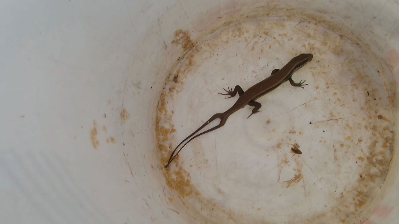 นางทองเทียน เล่าว่า ขณะกำลังดายหญ้าอยู่หน้าบ้านกับลูกหลาน ได้พบจิ้งเหลน 2 หางตัวดังกล่าวในพงหญ้า ซึ่งไม่ตกใจวิ่งหนีเหมือนจิ้งเหลนทั่วไปที่เมื่อพบคนจะรีบหนี แต่จิ้งเหลนตัวนี้กลับเชื่อง จึงจับไปปล่อยให้กินแมลง และไม่ได้สนใจอะไร