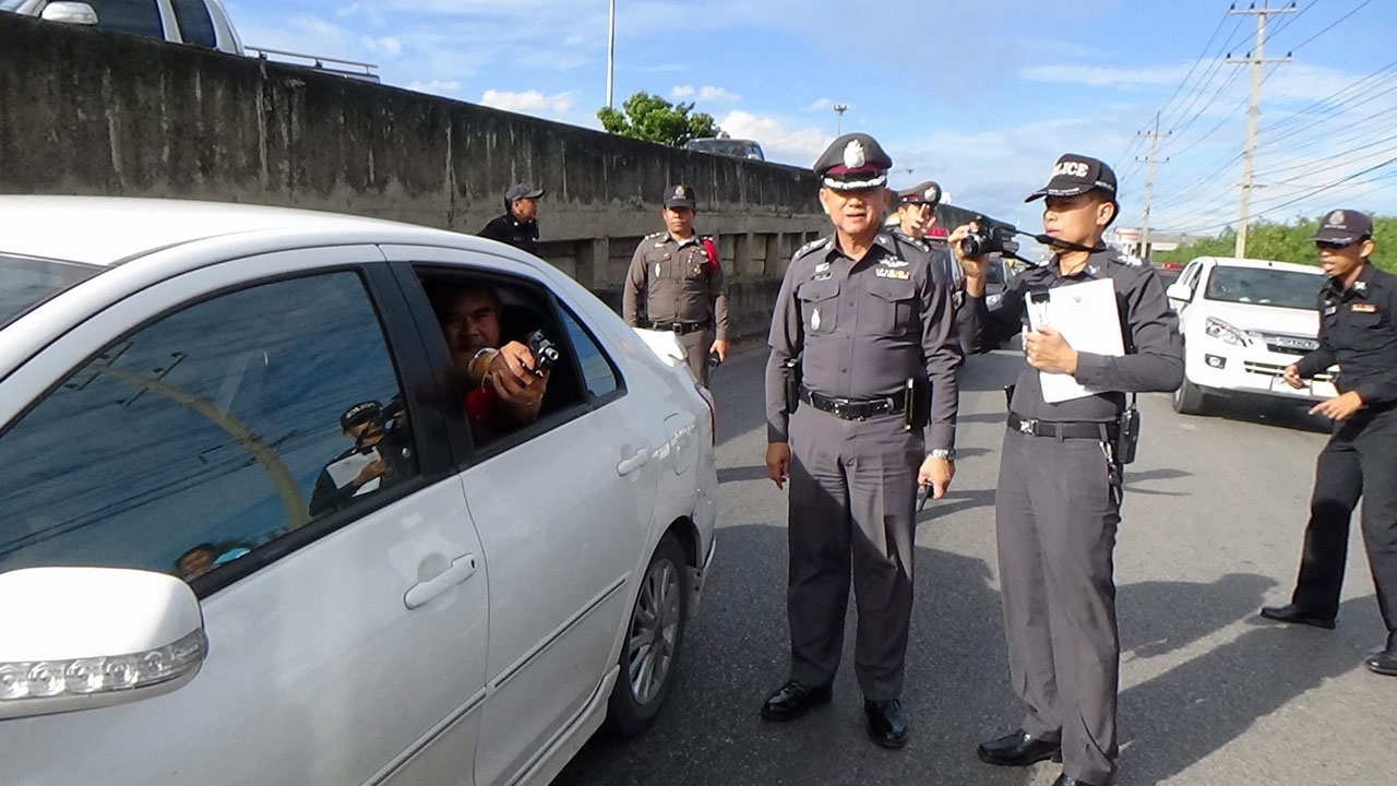 นายไชยณฤทธิ์ หวาดวารี มือปืนยิงสองสามีภรรยาบาดเจ็บ นั่งในรถเก๋งแสดงท่าใช้ปืน 9 มม.กระหน่ำยิง หลังตำรวจจับกุมมาสอบอ้างคู่กรณีขับรถปาดหน้าเลยยิงถล่ม 7 นัด ที่ถนนพระราม 2 อ.เมืองสมุทรสาคร.
