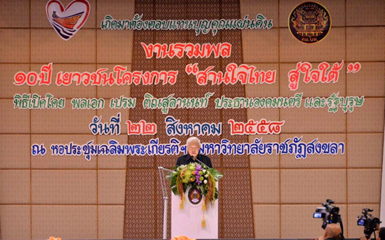 เมื่อเวลา 11.00 น. วันที่ 22 ส.ค. ที่หอประชุมเฉลิมพระเกียรติฯ มหาวิทยาลัยราชภัฏสงขลาอ.เมือง จ.สงขลา ฯพณฯ พล.อ.เปรม ติณสูลานนท์ ประธานองคมนตรีและรัฐบุรุษ เป็นประธานในพิธีเปิดงานรวมพล 10 ปี เยาวชนโครงการ “สานใจไทย สู่ใจใต้” โดยมี พล.อ.สุรยุทธ์ จุฬานนท์องคมนตรี ในฐานะประธานคณะกรรมการดำเนินงานโครงการฯ พล.ท.ปราการ ชลยุทธ แม่ทัพภาคที่ 4 นายภาณุ อุทัยรัตน์ เลขาธิการศูนย์อำนวยการบริหารจังหวัดชายแดนภาคใต้ นายธำรงค์ เจริญกุล ผวจ.สงขลา นายณรงค์ ชื่นนิรันดร์ ผู้อำนวยการสถานีวิทยุกระจายเสียงแห่งประเทศไทยจังหวัดสงขลา ร่วมให้การต้อนรับ พร้อมด้วยเยาวชนไทยมุสลิมในพื้นที่ 5 จังหวัดชายแดนภาคใต้ และครอบครัวอุปถัมภ์จากกรุงเทพมหานคร และ 10 จังหวัดปริมณฑล เข้าร่วมงานจำนวน 2,500 คนอย่างคึกคัก