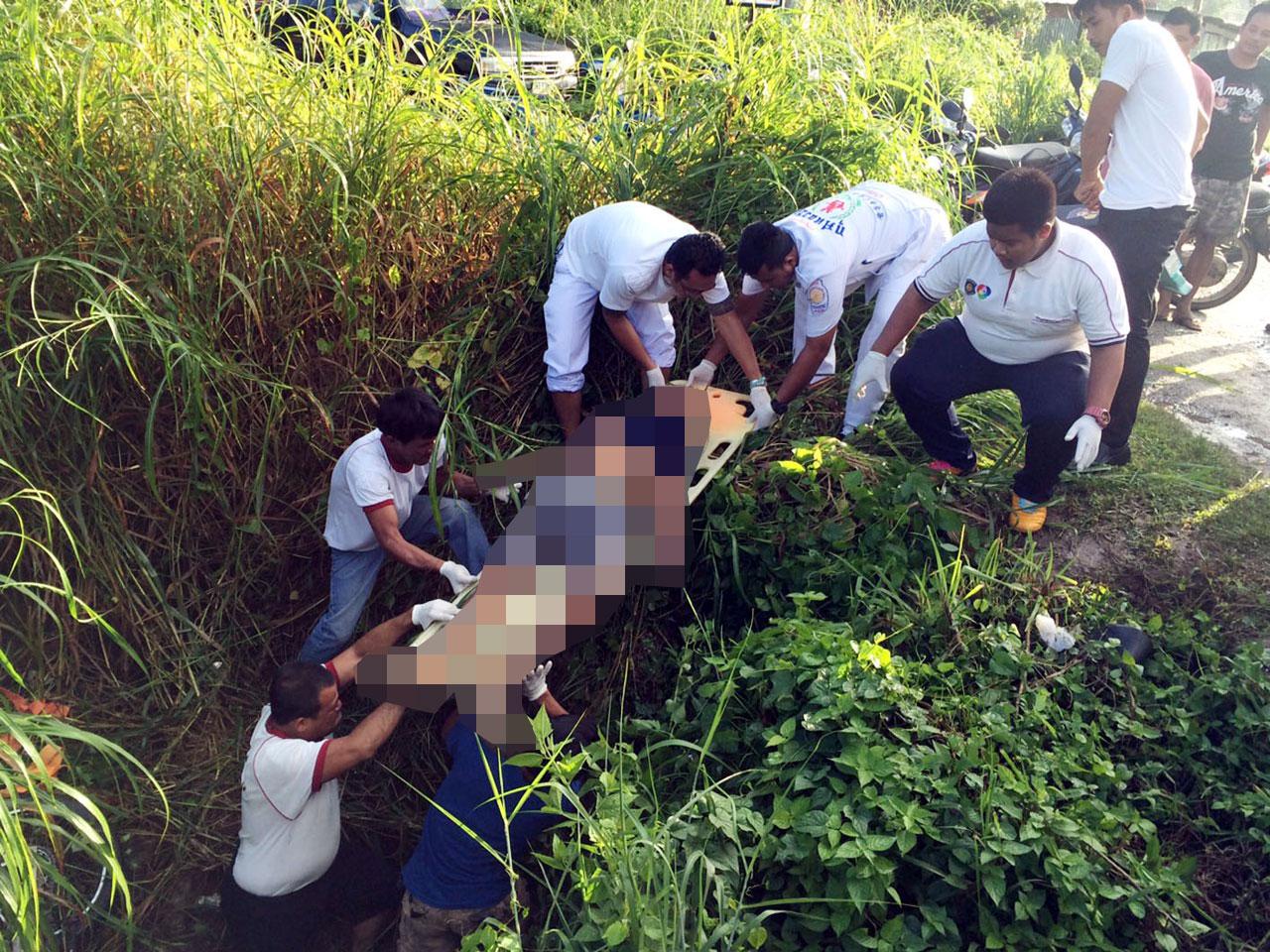 ที่เกิดเหตุเป็นถนนขนาด 2 เลน มีชาวบ้านมุงดูเหตุการณ์ ตรวจสอบป่าละเมาะข้างทางลึกจากถนนลงไปราว 2-3 เมตร เป็นร่องน้ำและใกล้ท่อระบายน้ำ พบรถจักรยานยนต์ซูซูกิ สีเขียว ทะเบียน กพม 515 ภูเก็ต ล้มคว่ำอยู่ในพงหญ้า เสียหาย ใกล้กันพบร่างชายสวมเสื้อโปโลแขนสั้นสีน้ำเงินเข้ม กางเกงขาสั้นสีเทา สวมรองเท้าแตะสีดำ ศีรษะจมลงไปในแอ่งน้ำที่ปกคลุมไปด้วยหญ้ารก เสียชีวิต ทราบชื่อคือ นายฉัตรชาย สมหวัง อายุ 34 ปี ชาวบ้าน หมู่ 1 ต.ป่าคลอก อ.ถลาง จ.ภูเก็ต ตามร่างกายไม่พบบาดแผลฉกรรจ์ เสียชีวิตมาแล้วไม่ต่ำกว่า 3-6 ชม. จึงนำศพขึ้นมาจากริมถนนส่งให้แพทย์ชันสูตรที่ รพ.ถลาง เพื่อหาสาเหตุการตายที่แน่ชัดอีกครั้ง ขณะเดียวกัน มีญาติของผู้เสียชีวิตเดินทางมาดูเหตุการณ์ และเมื่อเห็นศพนายฉัตรชาย ถึงกับร่ำไห้โผเข้ากอดศพท่ามกลางความโศกเศร้าเสียใจของผู้พบเห็นเป็นอย่างมาก