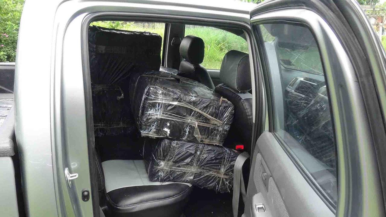 จากการตรวจค้นภายในรถกระบะ ปรากฏว่า พบกัญชาแห้งอัดแท่งบรรจุใส่ถุงดำจำนวน 8 แพ็ก แพ็กละ 40 กิโลกรัม รวมน้ำหนักประมาณ 320 กิโลกรัม ซุกซ่อนอยู่ห้องโดยสารเบาะหลังคนขับ จึงทำการตรวจยึดไว้เป็นของกลาง