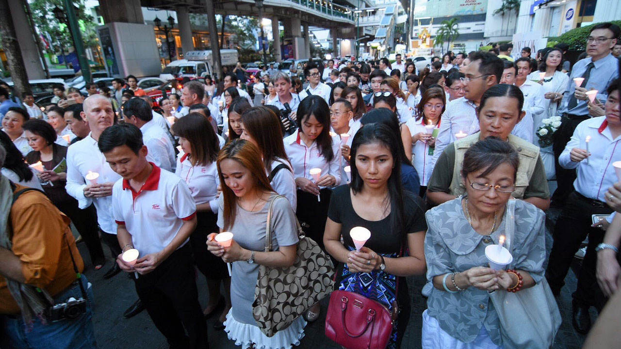 ประชาชนที่มาร่วมพิธีสวดบังสุกุลบริเวณหน้าห้างอัมรินทร์ พลาซ่า พากันจุดเทียนแล้วเดินไปวางไว้ที่ศาลท้าวมหาพรหม พร้อมยืนไว้อาลัยรำลึกถึงผู้เสียชีวิตทั้งชาวไทยและนักท่องเที่ยวชาวต่างชาติ 20 คน และได้รับบาดเจ็บกว่า 100 คน จากเหตุคนร้ายลอบวางระเบิดอย่างโหดเหี้ยม.