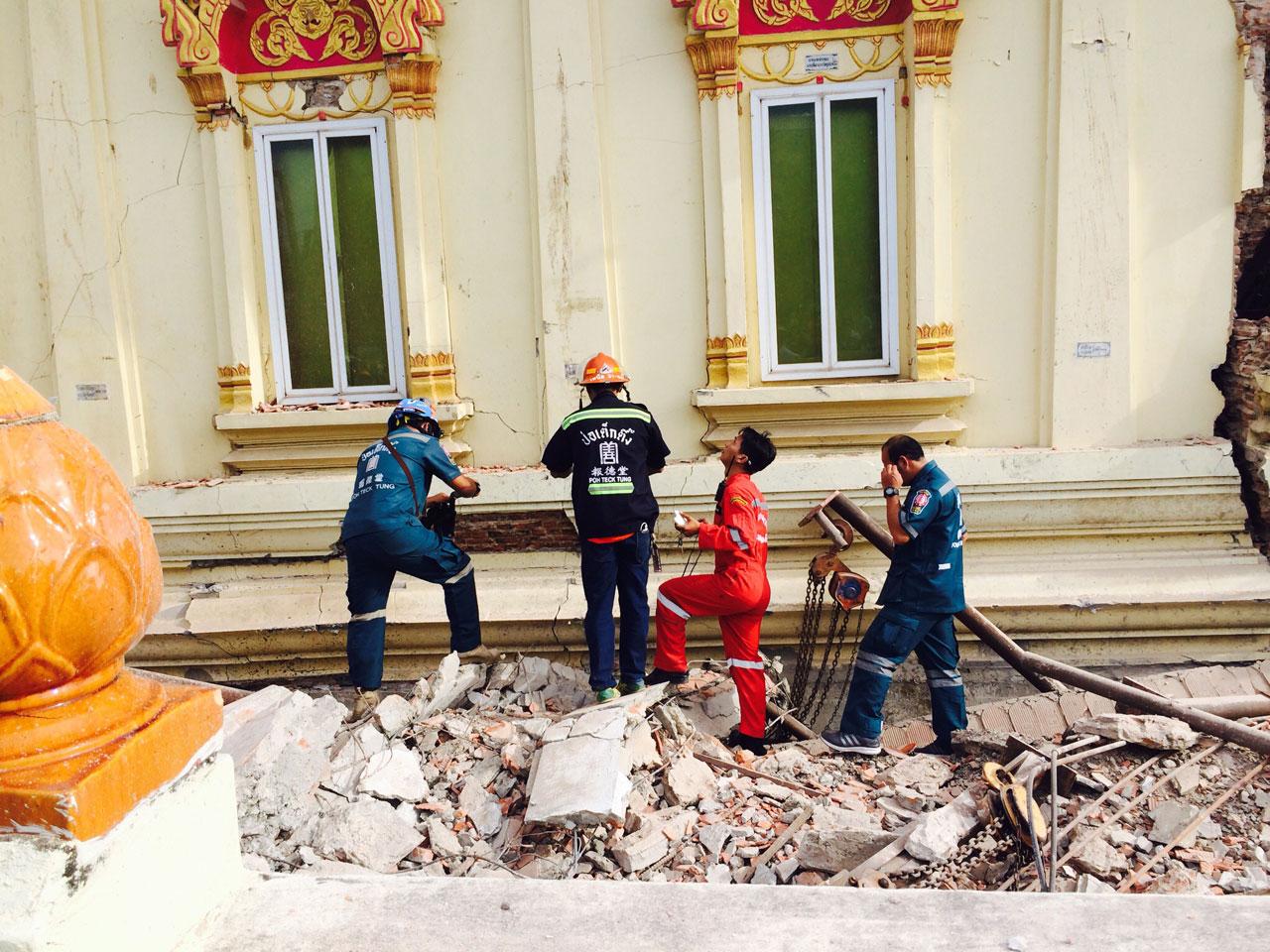 ในที่เกิดเหตุพบว่า พระอุโบสถซึ่งกำลังอยู่ระหว่างการก่อสร้างได้พังถล่ม ทับร่างของคนงาน เจ้าหน้าที่หน่วยกู้ภัยต้องใช้เครื่องตัดถ่างช่วยนำศพถูกที่ทับอยู่ใต้ซากปูนออกมา ทราบชื่อคือ นายณัฐวุฒิ สุวรรณชัยรบ อายุ 22 ปี ชาวจังหวัดนนทบุรี ตรวจสอบพบมีคนงานชายได้รับบาดเจ็บเล็กน้อย 1 ราย เจ้าหน้าที่เร่งนำส่งโรงพยาบาล