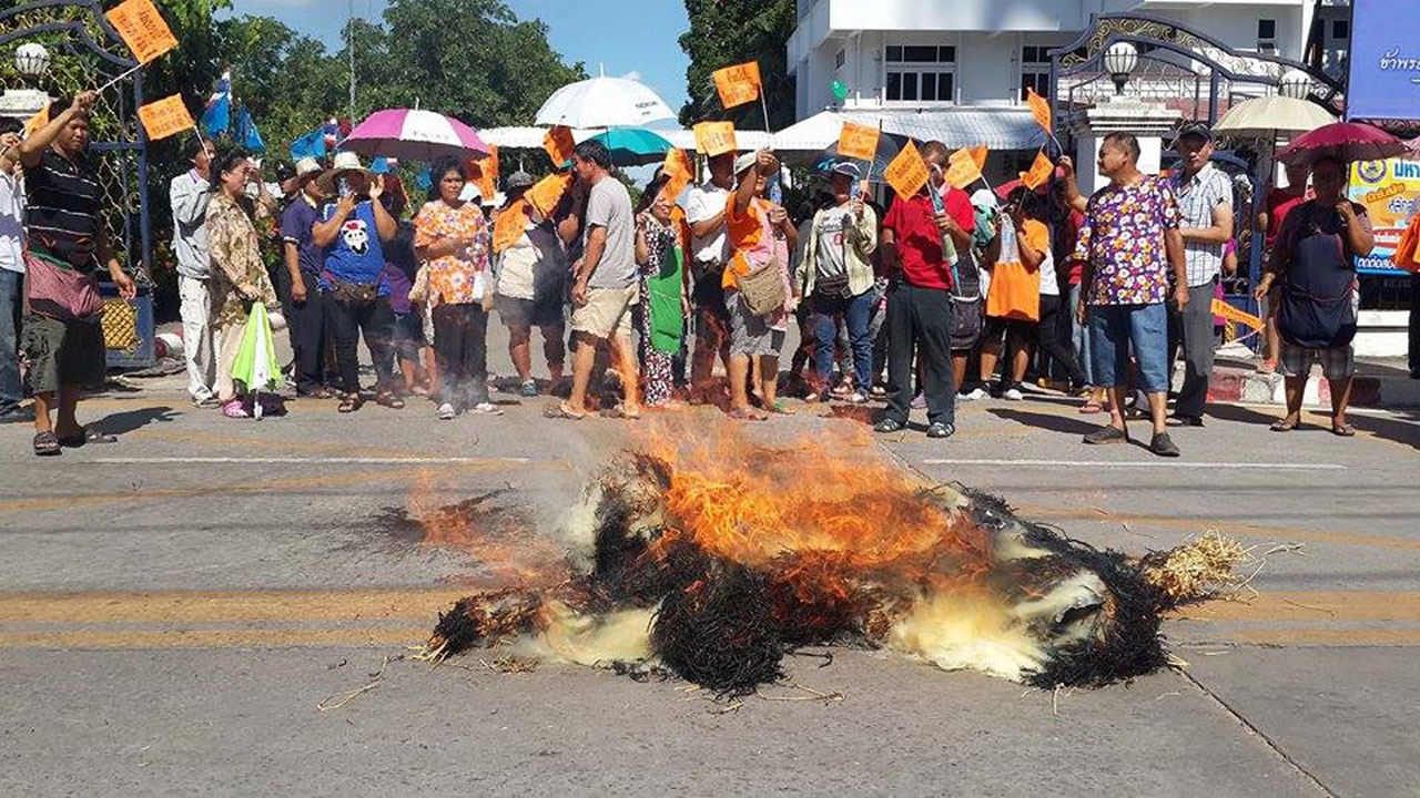 เมื่อเวลา 15.00 น. วันที่ 25 ส.ค. 58 ประชาชนชาวขอนแก่น ในนามกลุ่มรักษ์พัฒนา บขส.ขอนแก่น ประมาณ 100 คน ได้มารวมตัวกันที่ทางขึ้นศาลากลางจังหวัดขอนแก่น พร้อมนำหุ่นฟางซึ่งเป็นหุ่นของผู้ว่าราชการจังหวัดขอนแก่น และขนส่งจังหวัดขอนแก่น มาเรียกร้องคำตอบจาก นายกนก ศิริพานิช ขนส่งจังหวัดขอนแก่น และ นายกำธร ถาวรสถิตย์ ผู้ว่าราชการจังหวัดขอนแก่น ให้ยุติการย้าย บขส.แห่งที่ 1 ไปที่ บขส.แห่งที่ 3 และเรียกร้องให้ ผู้ว่าราชการจังหวัดขอนแก่น ลงมาพบ แต่ ผู้ว่าฯ ไปราชการ ส่วนขนส่งจังหวัดขอนแก่น ไม่มาพบ เวลาผ่านไปร่วม 2 ชม. ประชาชนจึงนำหุ่นฟางไปวางบนถนนหน้าเมือง ทางเข้าศาลากลางจังหวัดขอนแก่น แล้วใช้เท้าเหยียบย่ำก่อนจะจุดไฟเผา ท่ามกลางการรักษาความปลอดภัยของเจ้าหน้าที่ 3 ฝ่าย กว่า 100 นาย
