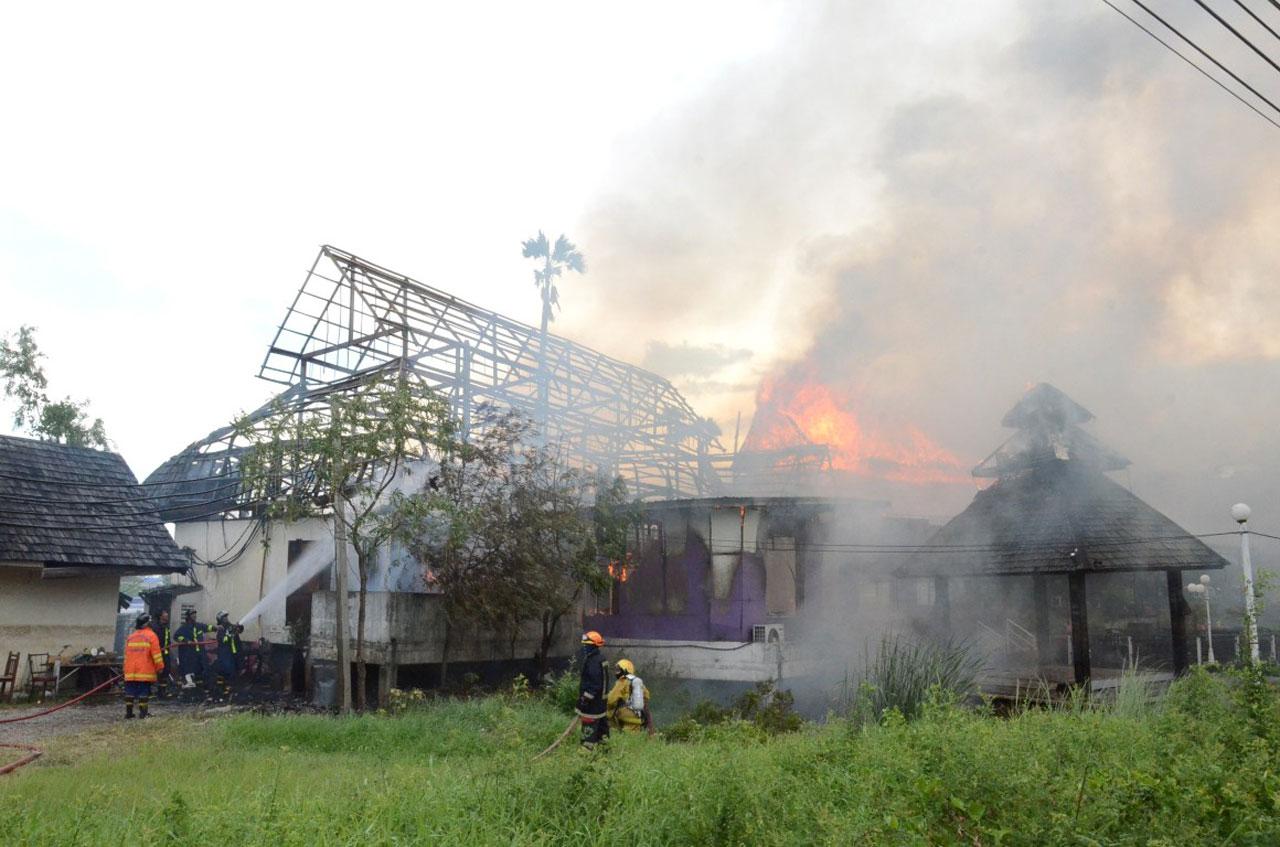 ในที่เกิดเหตุพบว่าเพลิงกำลังลุกไหม้หลังคาห้องที่ใช้รับรองลูกค้า เป็นอาคารสร้างด้วยไม้ทั้งหลัง และหลังคาทำจากปลีกไม้ จึงเป็นเชื้อเพลิงอย่างดี นอกจากนี้ยังมีลมแรง ทำให้เปลวไฟลุกลามติดห้องครัว ห้องคาราโอเกะอีกหลายห้อง เจ้าหน้าที่รถดับเพลิงต้องระดมฉีดน้ำสกัด ใช้เวลาร่วม 1 ชั่วโมง จึงสามารถควบคุมเพลิงไว้ได้ แต่ไหม้อาคารร้านเสียหายเกือบทั้งหมด ยกเว้นทางเดินและห้องคาราโอเกะที่สร้างแยกส่วนไว้ 10 ห้องที่ไฟลุกลามไปไม่ถึง