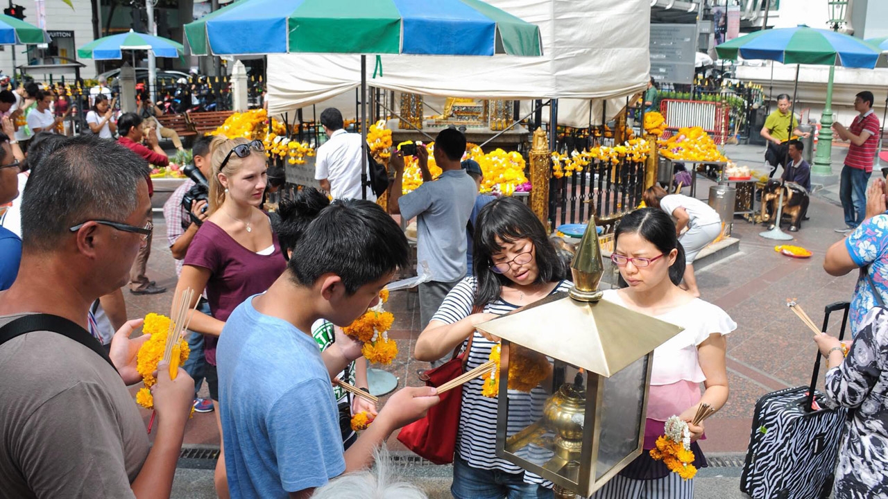 บรรยากาศการเข้าสักการะศาลพระพรหม เอราวัณ ของบรรดาผู้ศรัทธาทั้งชาวไทยและต่างชาติที่ค่อนข้างบางตา ขณะที่มูลนิธิทุนท่านท้าวมหาพรหมโรงแรมเอราวัณ สั่งทีมช่างนำนั่งร้านมาตั้งรอบองค์ท้าวมหาพรหมและนำผ้าขาวมาขึงสี่ด้าน รอทีมช่างสิบหมู่ของกรมศิลปากรเข้ามาบูรณะ.