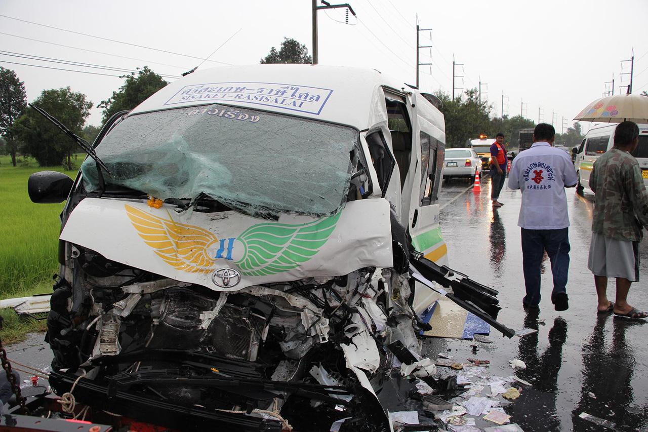 นายเรวัตร โพธิวัฒน์ อายุ 29 ปี อยู่บ้านเลขที่ 78 หมู่ 15 ต.ส้มป่อย อ.ราศีไศล จ.ศรีสะเกษ คนขับรถตู้ ให้การว่า ขับรถโดยสารมาจาก อ.ราษีไศล และจะเข้าไปส่งผู้โดยสารในตัวเมืองศรีสะเกษ เมื่อมาถึงที่เกิดเหตุฝนกำลังตก รถกระบะที่วิ่งสวนทางมาเสียหลักแฉลบออกมาขวางหน้ารถตู้ในระยะใกล้ จึงไม่สามารถหยุดรถได้ทัน ทำให้ชนเข้ากับท้ายรถกระบะจนหน้ารถตู้ยุบและรถหมุนกลับหัวไปทางเดิม ส่วนรถคู่กรณีตกจากถนนกระเด็นไปกลางทุ่งนาดังกล่าว