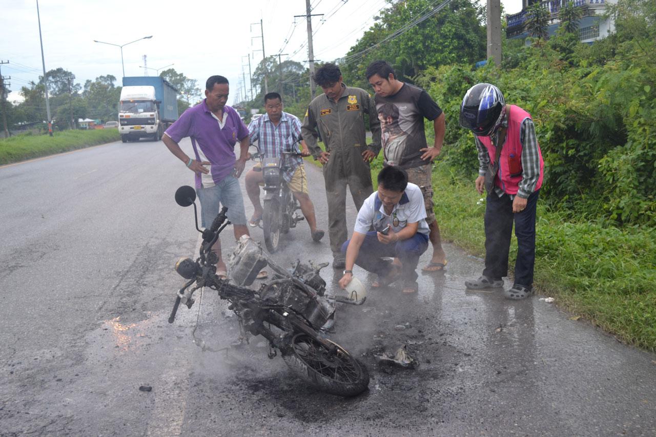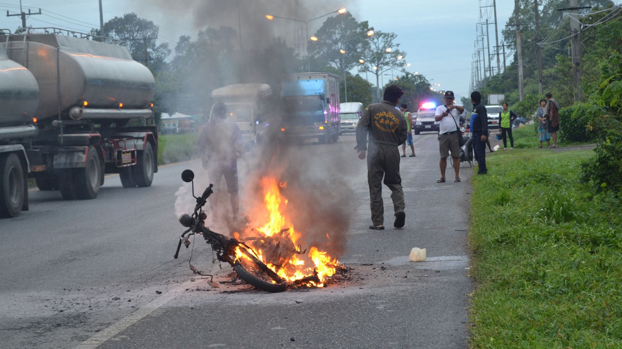 สาวนครนายกขี่จยย. ไปทำงาน เกิดไฟลุกไหม้ใต้ท้องรถ โชคดีหนีทัน ขณะรถเหลือแต่ซาก ตร. คาด สายไฟช็อตหรือสายน้ำมันแตกไปโดนท่อไอเสีย