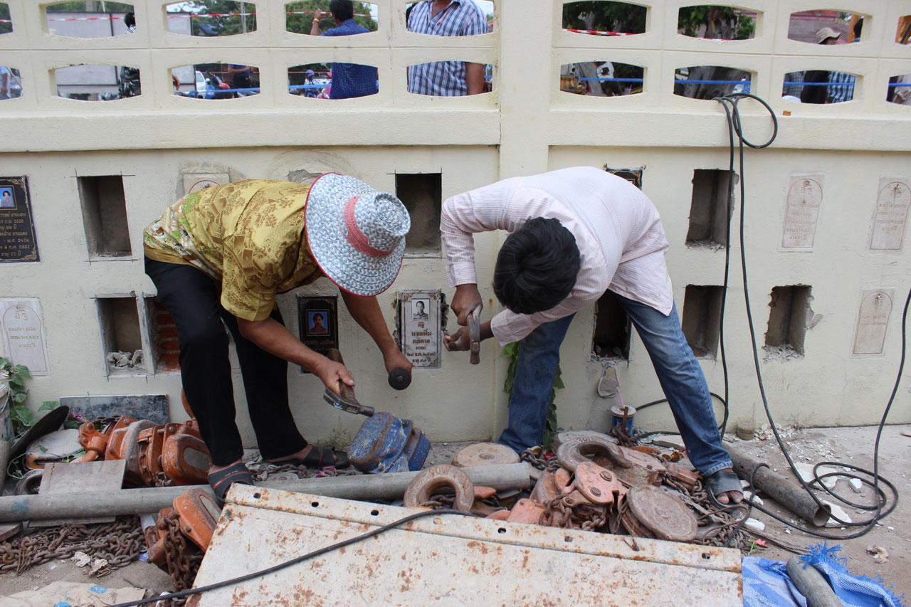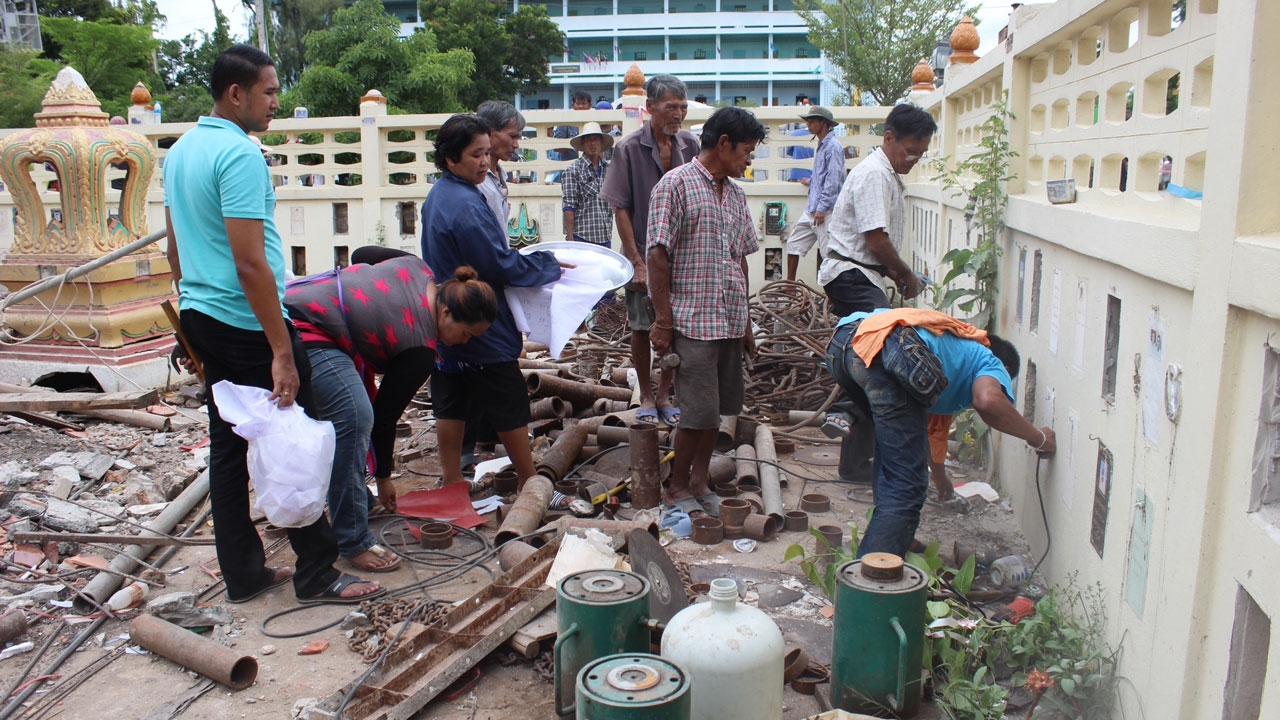 ส่วนบรรยากาศที่วัดต้นเชือก ที่เกิดเหตุ ชาวบ้านที่นำอัฐิของบรรพบุรุษมาบรรจุในช่องกำแพงโบสถ์ ได้ให้ช่างมาเจาะช่องเพื่อนำอัฐิออกมา ก่อนจะนำไปไว้ที่ศาลาวัด รอบรรจุในที่แห่งใหม่ ขณะที่แม่ค้าพ่อค้าที่นำสลากกินแบ่งรัฐบาลมาจำหน่ายต่างขายดี