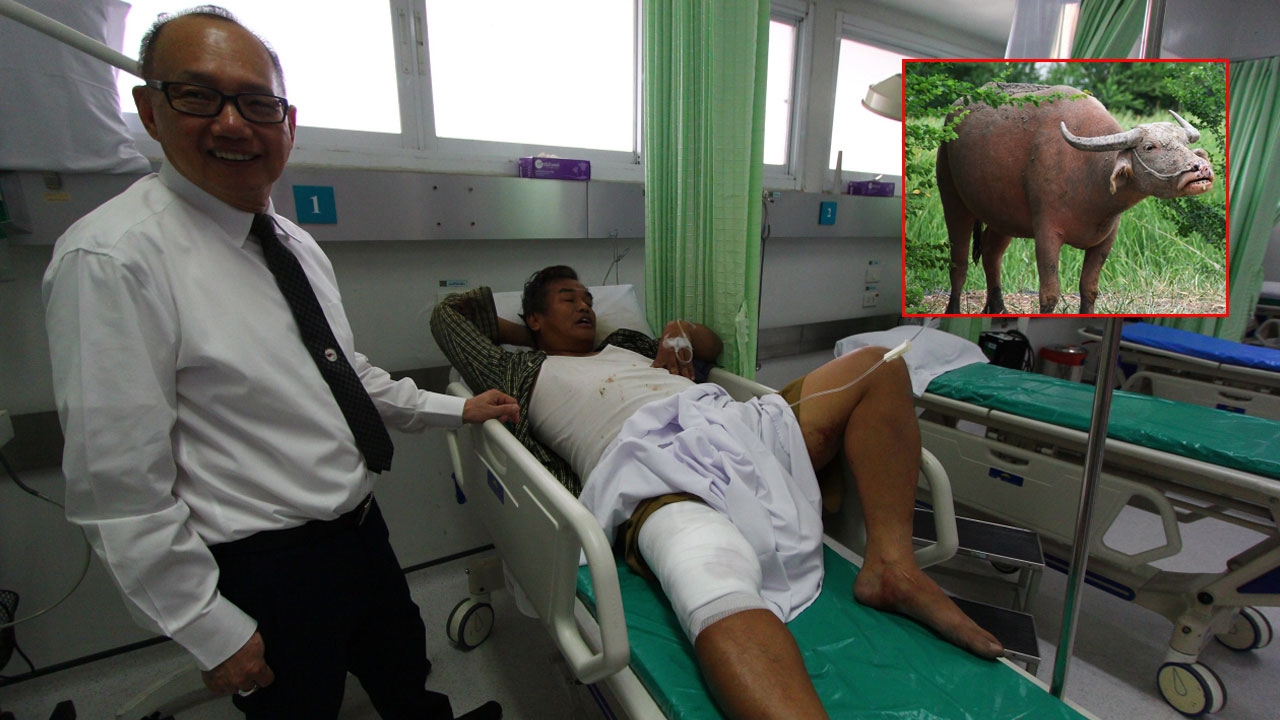 เมื่อเวลา 15.00 น. วันที่ 26 ส.ค.58 เจ้าหน้าที่อาสามูลนิธิป่อเต็กตึ๊ง นำตัว นายวิชัย ฉันทโชติ อายุ 55 ปี ผู้ใหญ่บ้านหมู่ 18 ต.บางพลีใหญ่ อ.บางพลี จ.สมุทรปราการ ส่งโรงพยาบาลจุฬารัตน์ 3 ภายหลัง ถูก ‘เจ้าขวัญ’ ควายเพศผู้ ที่ตัวเองเลี้ยงไว้นานกว่า 6 ปี ขวิดเข้าที่ต้นขาขวาจนได้รับบาดเจ็บ เป็นแผลลึกและยาวเกือบ 20 ซม. เหตุเกิดที่สวนข้างบ้านเลขที่ 21/376 ม.18 ต.บางพลีใหญ่ อ.บางพลี จ.สมุทรปราการ