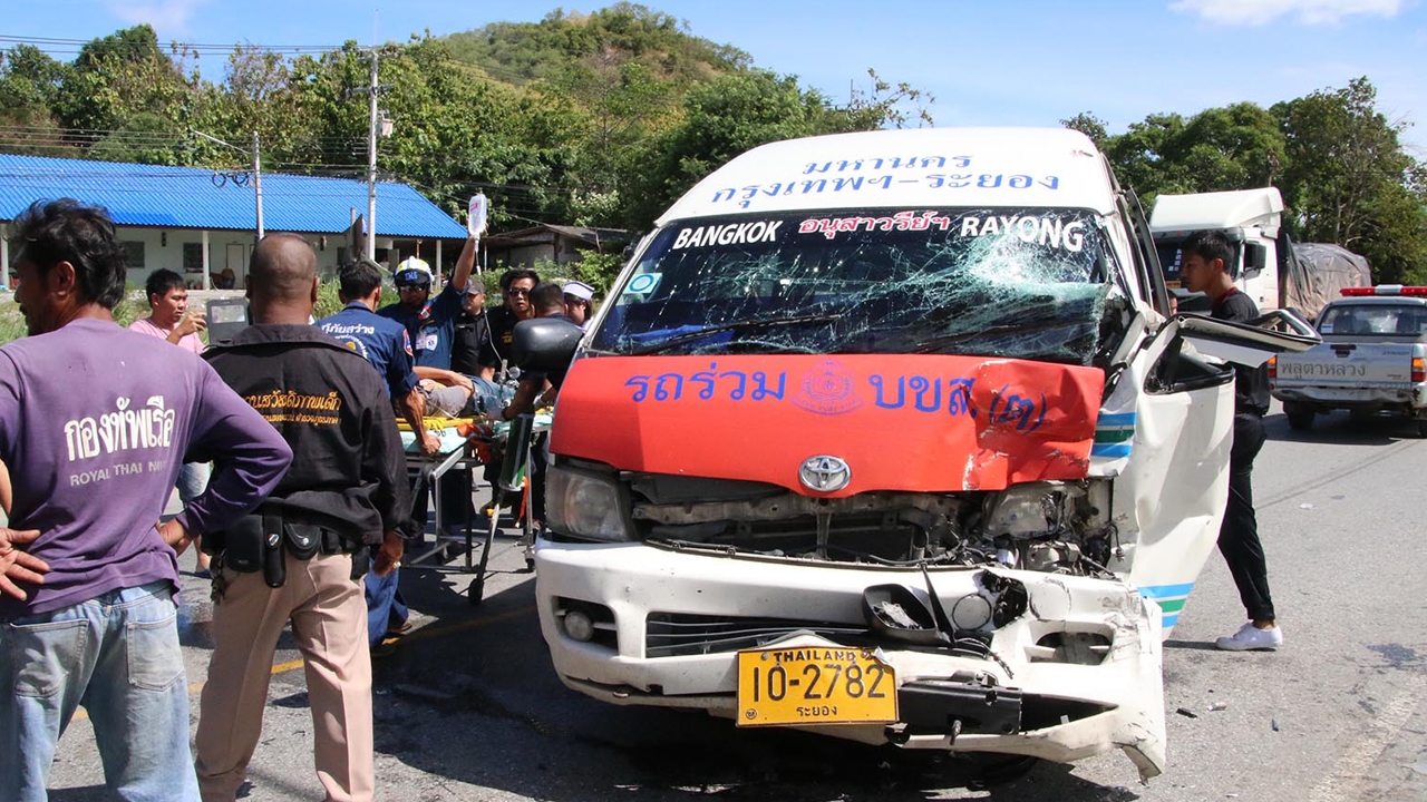 โชเฟอร์รถตู้โดยสาร กทม.-ระยอง เร่งเครื่องหวังแซงรถบัส เจอเทรลเลอร์สวนทาง หักหลบไม่พ้นเสยท้ายรถบัส ผู้โดยสารเจ็บสาหัส ติดคาเบาะข้างคนขับ 1 ราย