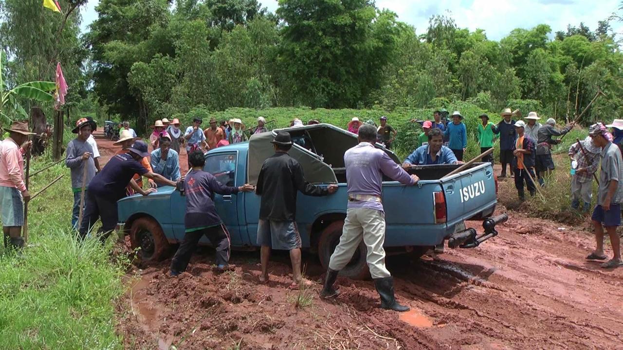 ที่หมู่บ้าน ได้พบกับชาวบ้านหลายสิบคนกำลังช่วยกันขนรถกระบะ 2 คันที่ลื่นไถลและติดหล่มอยู่บนถนนขึ้นมา สาเหตุจากฝนที่ตกทำให้ถนนที่เป็นดินโคลนเละและลื่น โชคดีที่ไม่มีใครได้รับบาดเจ็บ จากนั้นชาวบ้านได้ช่วยกันนำจอบเสียมมาขุดเอาดินที่อยู่ข้างทางขึ้นมาบนถนน เพื่อซ่อมแซมพอให้รถสามารถสัญจรไปมาได้