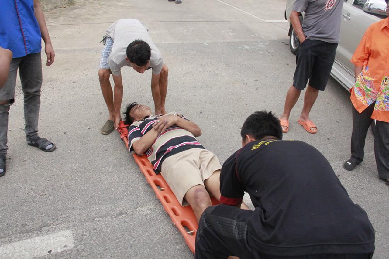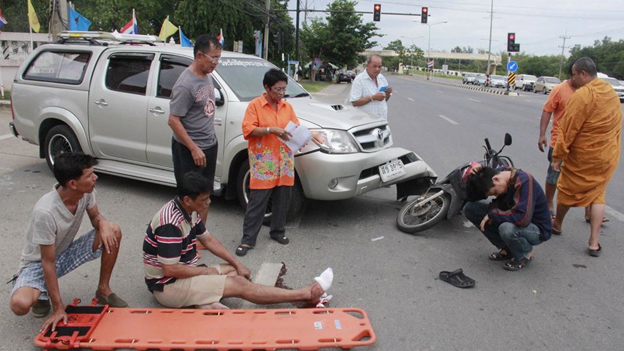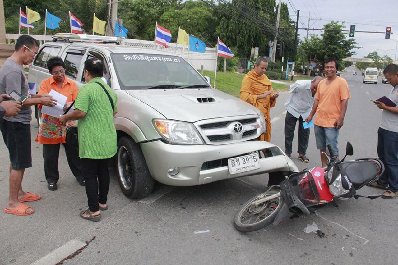 พันจ่าเอกประมาท ขี่จักรยานยนต์ย้อนศรชนรถกระบะเจ้าอาวาสวัดรังสีสุนทร ขณะข้ามแยกไฟจราจร นอนบาดเจ็บกลางถนน จนท. นำส่ง รพ.สมเด็จพระนางเจ้าสิริกิติ์