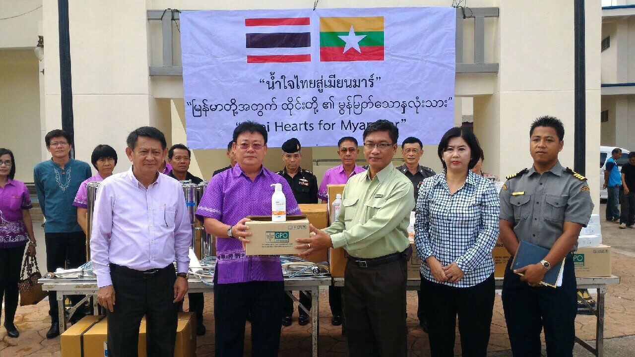 เมื่อเวลา 09.00 น. วันที่ 28 สิงหาคม 2558 ที่สำนักงานพัฒนาเขตเศรษฐกิจพิเศษตากอำเภอแม่สอด จังหวัดตาก นายสมชัยฐ์ หทยะตันย์ติ ผวจ.ตาก นายสุทธา สายวานิชย์ รอง ผวจ.ตาก เป็นตัวแทนมอบเวชภัณฑ์ และอุปกรณ์ทางการแพทย์มูลค่า 4 ล้านบาท เพื่อนำไปช่วยเหลือผู้ประสบอุทกภัยในประเทศเมียนมา โดยมี นายอูหล่วย กั่วอู ผวจ.เมียวดี นางติ่น ติ่น เมียะ ประธานหอการค้าจังหวัดเมียวดี เดินทางมารับมอบด้วยตนเอง