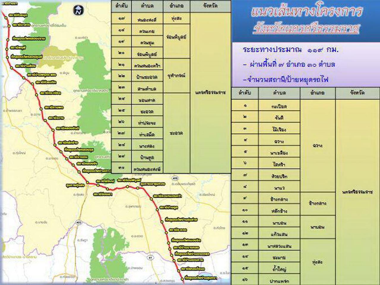 "โครงการก่อสร้างรถไฟทางคู่ช่วงสุราษฎร์ธานี-ชุมทางหาดใหญ่-สงขลา มีระยะทางรวม 323 กิโลเมตร มีสถานี/ป้ายหยุดรถไฟ 60 แห่ง ผ่านพื้นที่ทั้งหมด 4 จังหวัด คือ จ. สุราษฎร์ธานี ระยะทาง 67 กิโลเมตร ผ่านพื้นที่ 4 อำเภอ 11 ตำบล จำนวนสถานี/ป้ายหยุดรถไฟ 13 แห่ง จ.นครศรีธรรมราช ระยะทาง 119 กิโลเมตร ผ่านพื้นที่ 7 อำเภอ 30 ตำบล จำนวนสถานี/ป้ายหยุดรถไฟ 23 แห่ง จ.พัทลุง ระยะทาง 77 กิโลเมตร ผ่านพื้นที่ 6 อำเภอ 23 ตำบล จำนวนสถานี/ป้ายหยุดรถไฟ 18 แห่ง และ จ.สงขลา ระยะทาง 60 กิโลเมตร ผ่านพื้นที่ 5 อำเภอ 16 ตำบล จำนวนสถานี/ป้ายหยุดรถไฟ 6 แห่ง"