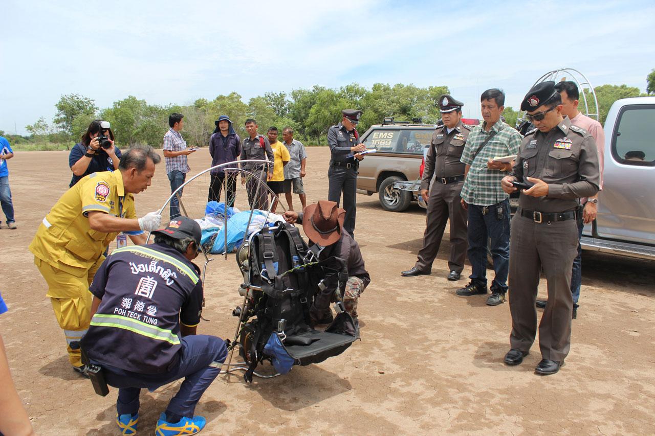 จากการพลิกศพ พบว่าต้นขาขวา แขนขวาหัก นอกจากนี้บนพื้นดินพบร่องรอยครูดเป็นทางยาวประมาณ 10 เมตร เบื้องต้นทราบว่า ผู้เสียชีวิตเป็นนักเรียนฝึกบินเครื่องร่อน พารามอเตอร์