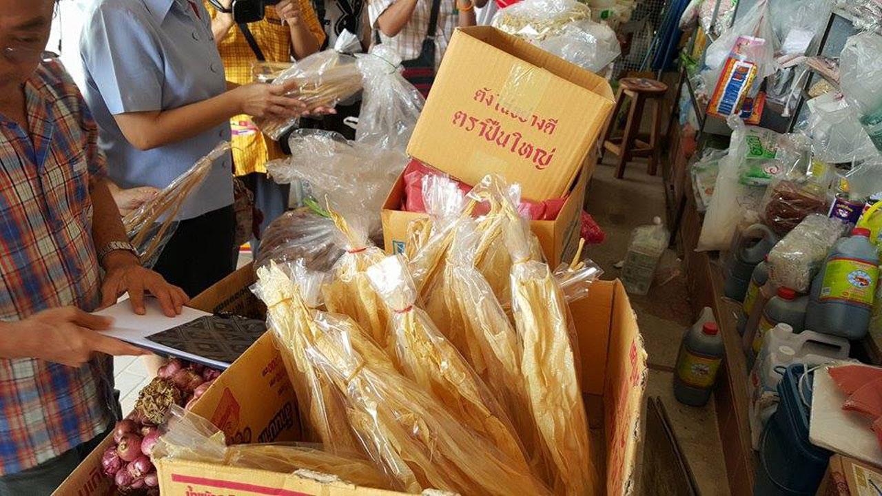 เกี่ยวกับเรื่องนี้ เมื่อเวลา 15.00 น. วันที่ 29 ส.ค. นายสมคิด ตันติไวทยพันธ์ นักวิชาการสาธารณสุขเชี่ยวชาญ ดูแลคุ้มครองผู้บริโภค สำนักงานสาธารณสุข จ.สุโขทัย และ นายอธิราช วรรณา รองนายกเทศมนตรีเมืองสุโขทัยธานี ได้นำเจ้าหน้าที่ออกสำรวจร้านค้า ประเภทขายอาหารแห้ง พบว่ามีอยู่ 2 ร้านที่จำหน่ายฟองเต้าหู้ คือ ร้านเจ๊ขวัญตา ตั้งอยู่ริมฟุตปาท ถ.ทัศนาพานิช 3 ต.ธานี และร้านเจ๊อุ่ย อยู่ภายในตลาดสด 2 ชั้น โดยฟองเต้าหู้ทั้งหมด ทั้ง 2 ร้าน ให้การตรงกันว่า สั่งซื้อมาจากยี่ปั๊วรายหนึ่งที่ตลาดเยาวราช กรุงเทพฯ ข้างกล่องบรรจุระบุยี่ห้อ บริษัทผู้ผลิต อยู่ในย่านสุขสวัสดิ์ เขตจอมทอง กรุงเทพฯ