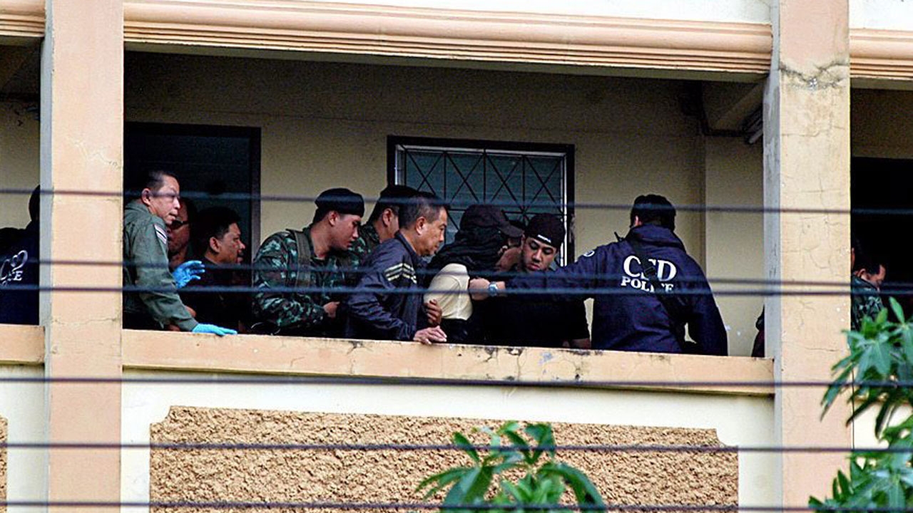 พล.ต.อ.สมยศ พุ่มพันธุ์ม่วง ผบ.ตร.ขึ้นไปนำตัวนายอาเดม การาดัค ที่ถูกคลุมไอ้โม่ง ผู้ต้องสงสัยคดีระเบิดแยกราชประสงค์ ที่หนีไปกบดานอยู่ที่พูลอนันต์อพาร์ตเมนต์ ย่านหนองจอก ไปสอบสวน ส่วนอีกภาพ เป็นท่อเหล็กที่น่าเชื่อเป็นอุปกรณ์ทำระเบิดชนิดเดียวกับที่แยกราชประสงค์