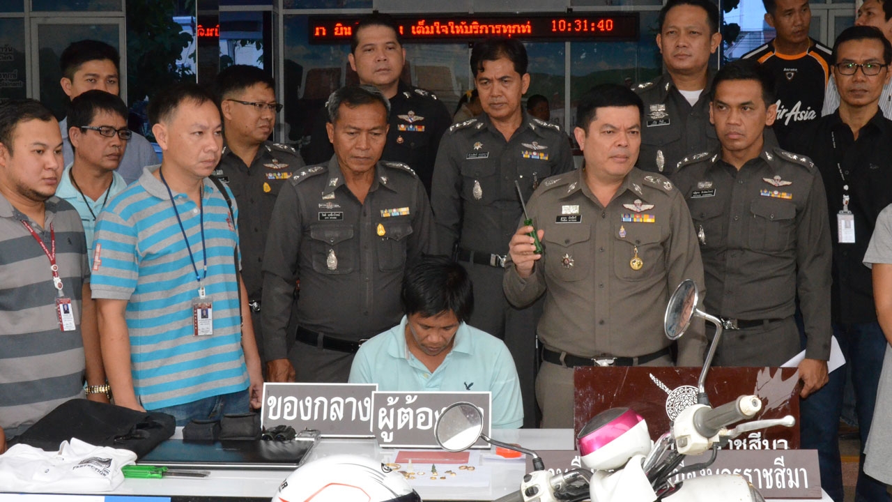 โดยก่อนหน้านี้ตำรวจรับแจ้งมีคนร้ายขี่รถจักรยานยนต์ ยามาฮ่า ฟีโน่ สีม่วง ทะเบียน งยธ 831 นครราชสีมา ตระเวนขี่รถช่วงกลางวัน ดูว่าเจ้าของบ้านหลังไหนออกไปทำงาน ไม่มีคนอยู่บ้าน ก่อนใช้ไขควงงัดประตู หน้าต่าง เข้าไปรื้อค้นเอาทรัพย์สิน อาทิ เครื่องเพชร ทองคำแท่ง สร้อยคอทองคำ แหวนทองคำ เงินสด พระเลี่ยมทอง และโน้ตบุ๊ก รวมมูลค่าทรัพย์สินของผู้เสียหายทุกรายกว่า 1 ล้านบาท ก่อนนำไปขาย หาเงินมาใช้จ่าย เมื่อเงินหมดก็จะออกตระเวนก่อเหตุใหม่ ตำรวจสามารถสืบสวนติดตามจับกุมตัวได้ภายในหอพักทวีลักษณ์ ต.ในเมือง อ.เมืองนครราชสีมา พร้อมของกลางจำนวนหนึ่ง ไขควงที่ใช้ก่อเหตุ 3 ด้าม พร้อมรถจักรยานยนต์