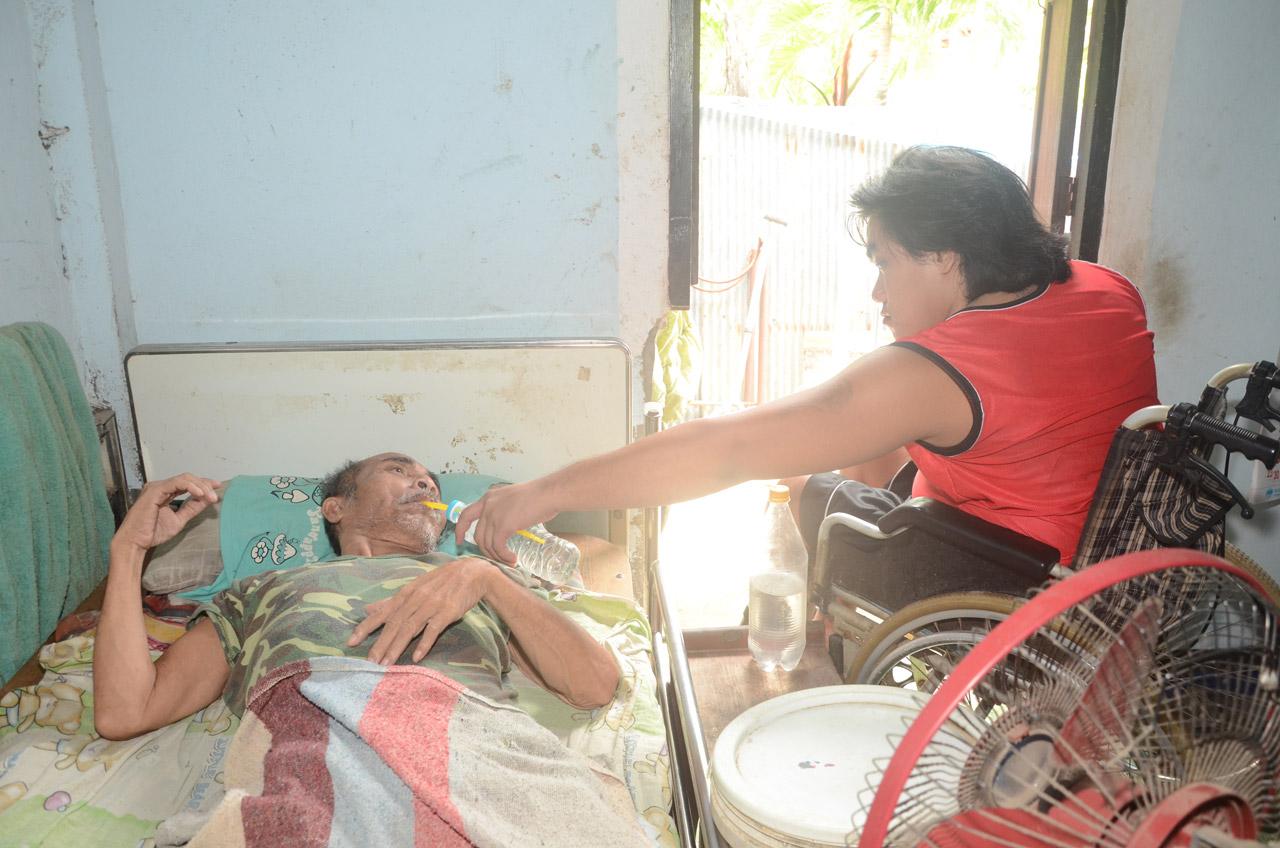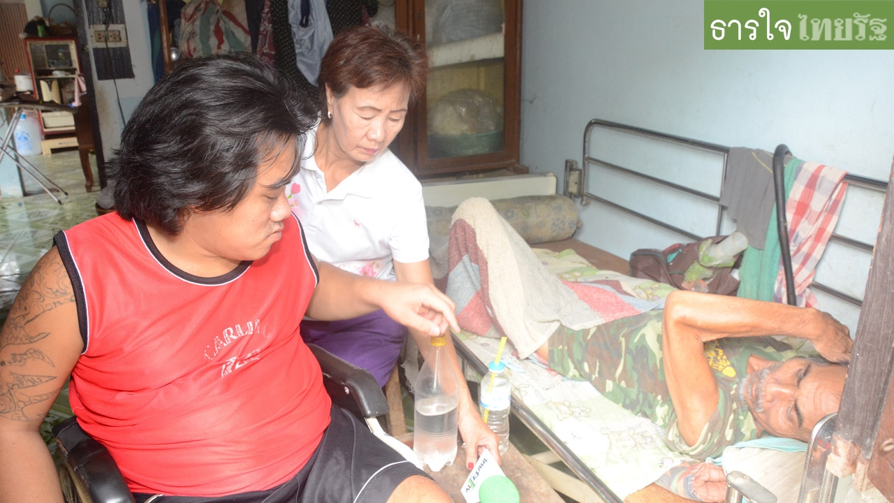 นางพัชรินทร์ ยังกล่าวอีกว่า ทุกวันนี้ตอนเช้าต้องซื้อผัก อาหารแห้ง เตรียมไว้ให้ให้ลูกชายเพื่อปรุงกินเองบ้าง แม้ไม่ถนัด เพราะนั่งรถเข็น ทำเสร็จต้องมาป้อนให้พ่อกิน เพราะตนไม่ได้ดูแลต้องไปรับจ้างเฝ้าคนชรา ส่วนความช่วยเหลือจากส่วนราชการทั้งสองยังไม่มีสิทธิ เนื่องจากนายศรีรัตน์จะครบ 60 ปี ในเดือนตุลาคมนี้ ส่วนลูกชายเพิ่งได้ 19 ปี ทุกวันนี้หากจะพบแพทย์ตามนัดต้องขอไปยืมเงินญาติ มีก็มาใช้เร็วบ้างช้าบ้าง เพื่อนำมาจ่ายเป็นค่ารถสองแถว ส่วนลูกชายยังแข็งแรงไม่เจ็บไข้ แต่เดินไม่ได้เท่านั้น ของใช้ภายในบ้าน พวกเครื่องใช้ไฟฟ้าตู้เย็นหรืออื่นๆ ก็ต้องงด เพราะตัดรายจ่ายค่าไฟฟ้า อย่างวันนี้ต้องยืมเงินมาจ่ายค่าฌาปนกิจประจำหมู่บ้านเป็นเงินถึง 190 บาท ในส่วนนี้ต้องจ่ายทันทีหากไม่จ่ายคนในครอบครัวเสียชีวิตจะไม่ได้รับเงินค่าฌาปนกิจ