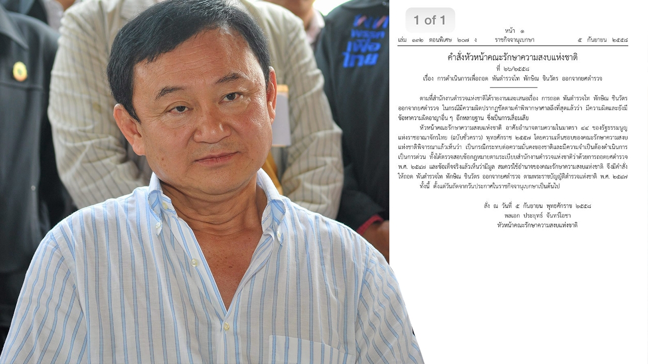18.15 น. เว็บไซต์ราชกิจจานุเบกษา ลงคำสั่งหัวหน้า คสช.เมื่อวันที่ 5 ก.ย.2558 อาศัยอำนาจตามมาตรา 44 ให้ถอดยศ พันตำรวจโท ของ พ.ต.ท.ทักษิณ ชินวัตร ออกจากยศ ตร.แล้ว พระราชบัญญัติตํารวจแห่งชาติ พ.ศ. 2547...