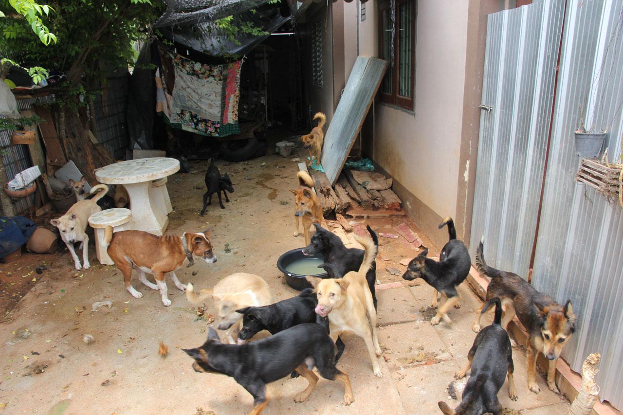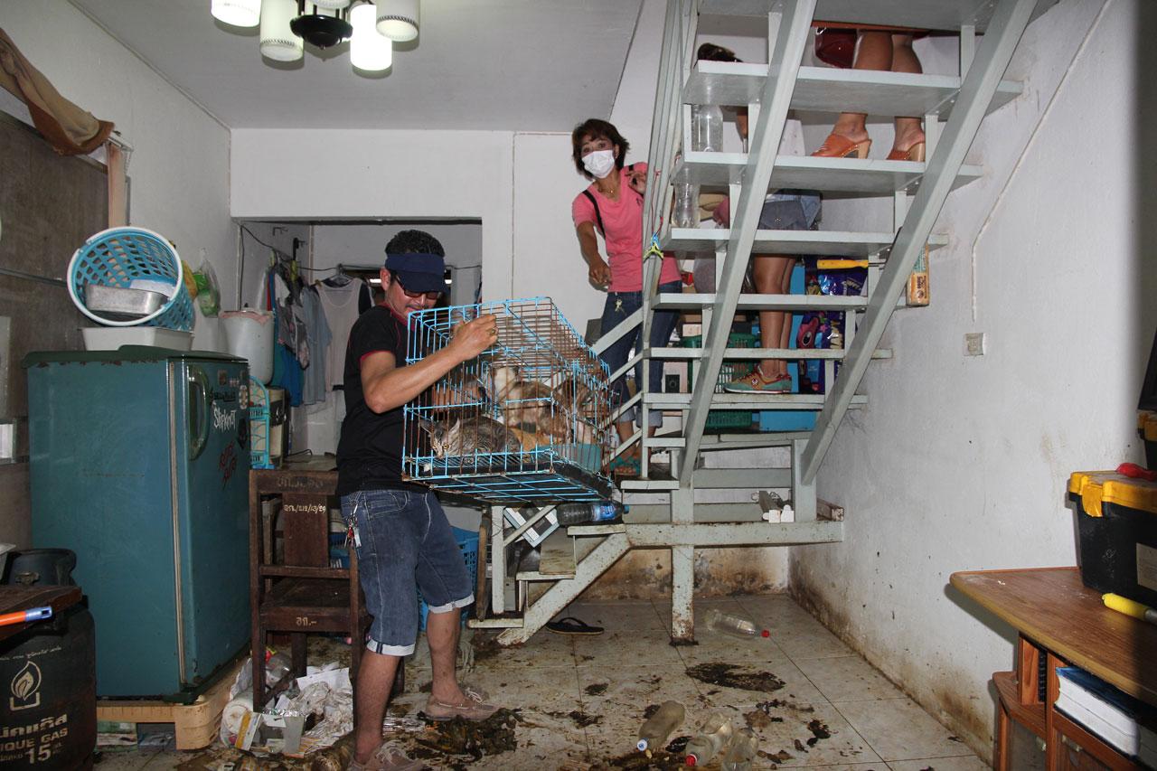 เมื่อเจ้าหน้าที่ไปถึงปรากฏว่า บ้านหลังดังกล่าวถูกปิดล็อกแน่นหนา ได้ยินเสียงสุนัขเห่ากระโชก และส่งเสียงร้องด้วยความหิวโหย เจ้าหน้าที่จึงได้พยายามติดต่อเจ้าของบ้าน แต่ไม่สามารถติดต่อได้ จึงได้ตัดสินใจใช้คีมตัดเหล็ก ตัดกุญแจเข้าไป จากการตรวจสอบภายในบ้าน เมื่อเปิดเข้าไปเจ้าหน้าที่ถึงกับผงะเมื่อเห็นสภาพภายในบ้าน ที่มีแต่มูลของสุนัขเต็มพื้นบ้าน และซากสุนัขตายที่เกิดจากการกินกันเอง ส่งกลิ่นเหม็นอย่างรุนแรง แยกเป็นสุนัข 25 ตัว ลูกหมาเพิ่งเกิด 2 ตัว และแมว 9 ตัว ถูกขังไว้ภายในซึ่งถูกทิ้งไว้เป็นเดือน อยู่ในสภาพอดโซ และอิดโรย เนื่องจากการถูกทิ้งไว้โดยไม่มีอาหารและน้ำ จนผอมเห็นซี่โครง และหวาดระแวง เจ้าหน้าที่จึงช่วยกันให้อาหารและน้ำบรรเทาความหิวในเบื้องต้น