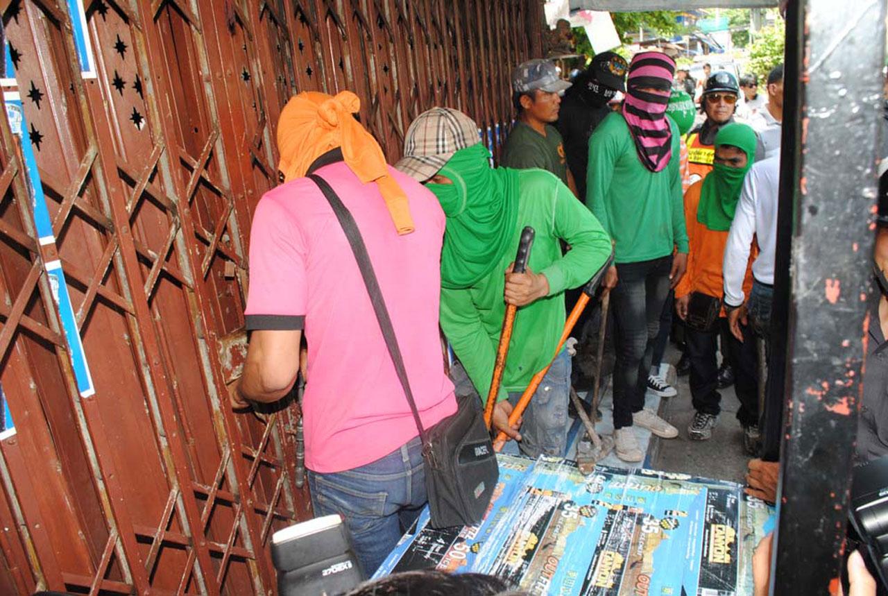 จนกระทั่งเวลาผ่านไป 1 ชั่วโมง ก็ไม่มีผู้ใดแสดงตัวว่า เป็นเจ้าของบ้านหรือผู้พักอาศัยภายในบ้าน จากนั้น เจ้าหน้าที่จึงได้กระชับวงล้อม กันผู้ไม่เกี่ยวข้องออกจากบริเวณหน้าบ้าน เป็นรัศมีประมาณ 10 เมตร แล้วสั่งการให้คนงานใช้คีมขนาดใหญ่ตัดแม่กุญแจทั้ง 2 ชั้น ก่อนเปิดประตูเข้าไปสำรวจหาบุคคลและทรัพย์สินภายในบ้าน ปรากฏว่า ไม่มีผู้พักอาศัย พบเพียงแต่ข้าวของเครื่องใช้ที่ใช้สำหรับประกอบอาชีพ อาทิ ถังแก๊ส ตู้แช่ของสด แผงไข่ ลังถึงนึ่งขนมจีบ ซุ้มตั้งร้าน จึงทำบันทึกตรวจยึดเอาไว้ เพื่อรอเจ้าของบ้านนำเอกสารไปรับกลับจากกรมบังคับคดี