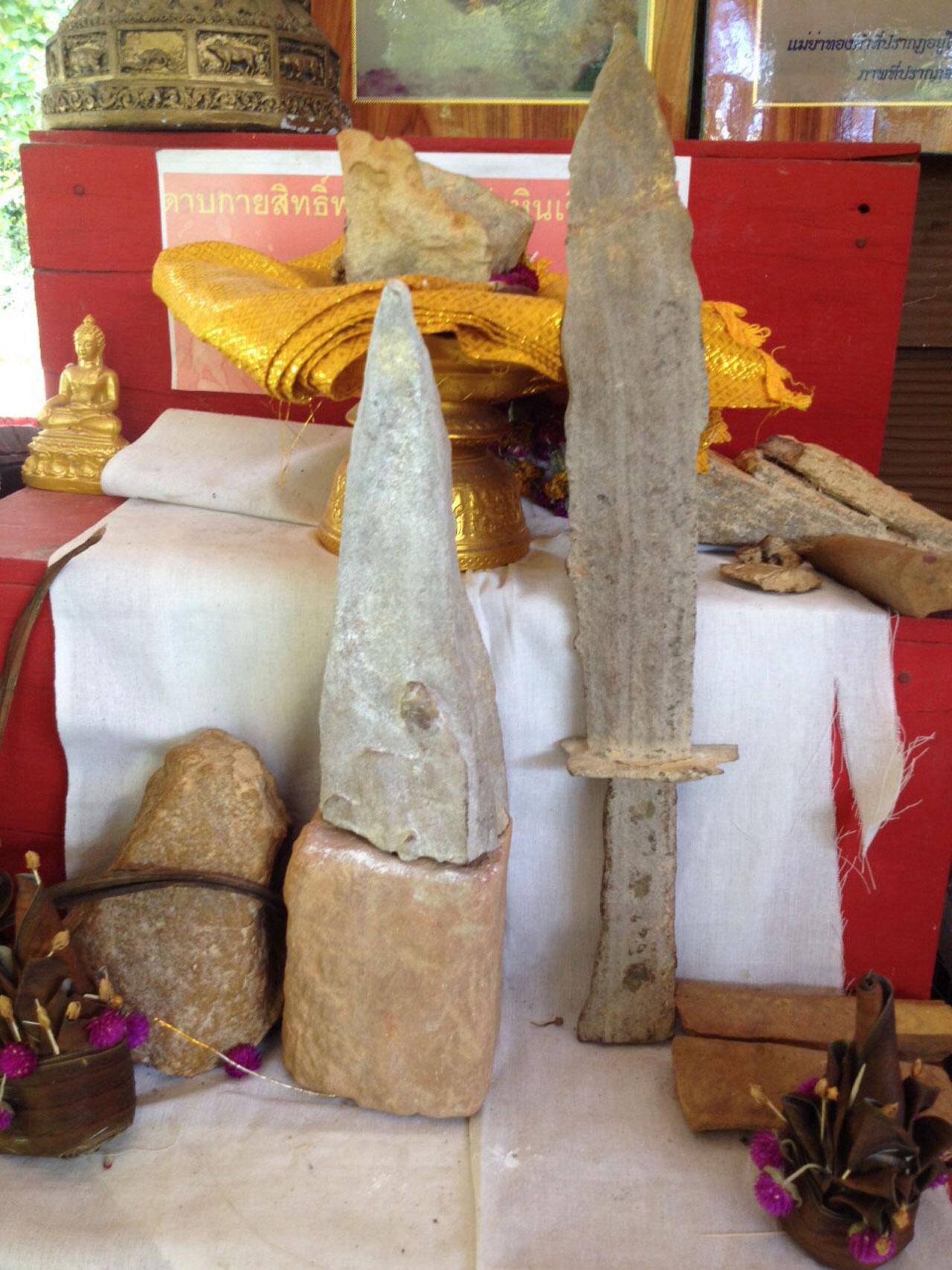 พระบุญศรี กล่าวด้วยว่า ขณะนี้ ทางวัดยังไม่ทราบแน่ชัดว่ามีดกริชและหินทรายลักษณะ คล้ายเขี้ยวยักษ์ที่พบมีอายุเท่าใด เป็นของโบราณหรือไม่ จึงรอการตรวจสอบจากเจ้าหน้าที่ที่มีส่วนเกี่ยวข้องเพื่อคลายข้อสงสัยของชาวบ้านต่อไป