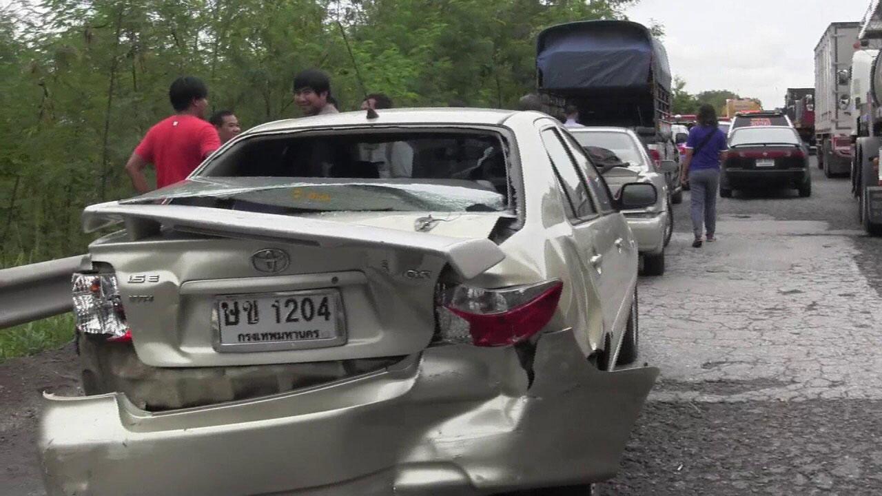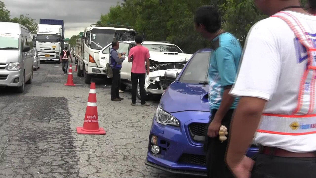 6 ล้อบรรทุกแก๊สเบรกไม่อยู่ ชนท้ายรถพ่วง 18 ล้อ ก่อนรถที่ตามหลังมาเบรกไม่ทันชนต่อกันรวม 13 คัน ทำรถติดกว่า 2 กม. ด้าน จนท. คาด ฝนตกถนนลื่น เร่งระบาย 2 ชม. เข้าสู่ภาวะปกติ