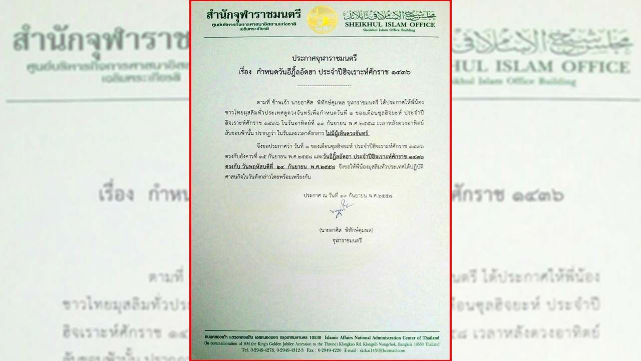 จึงขอประกาศว่า วันที่ 1 ของเดือนซุลฮิจยะห์ ประจำปีฮิจเราะห์ศักราช 1436 ตรงกับวันอังคารที่ 15 กันยายน พ.ศ. 2558 และวันอีฎิ้ลอัดฮา ประจำปีฮิจเราะห์ศักราช 1436 ตรงกับ วันพฤหัสบดีที่ 24 กันยายน พ.ศ. 2558 จึงขอให้พี่น้องมุสลิมทั่วประเทศ ได้ปฏิบัติศาสนกิจ ในวันดังกล่าวโดยพร้อมเพรียงกัน.
