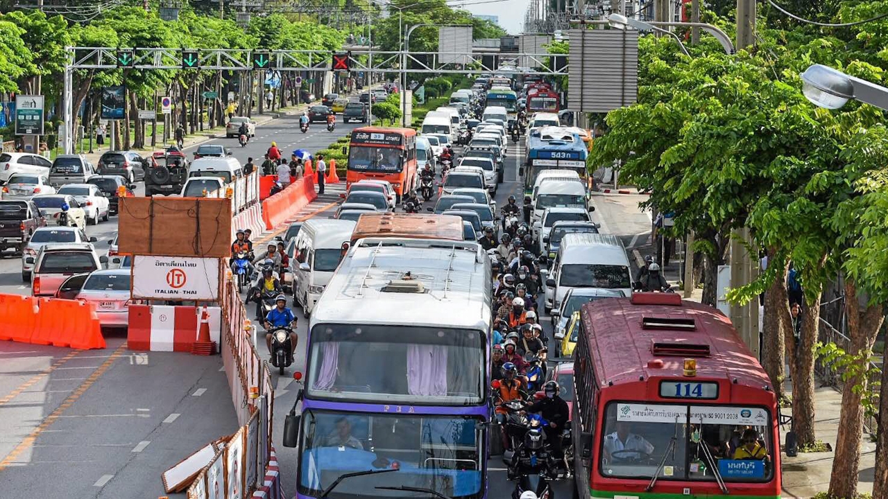 สภาพการจราจรช่วงเช้าวันจันทร์ของวันทำงานรถติดวินาศสันตะโร บนถนนพหลโยธินขาเข้า หลังปิดสะพานข้ามแยกเกษตรเพื่อก่อสร้างรถไฟฟ้า ตำรวจแนะผู้ใช้รถให้เลี่ยงใช้เส้นทางอื่น และควรปรับตัวออกจากบ้านให้เร็วขึ้น.