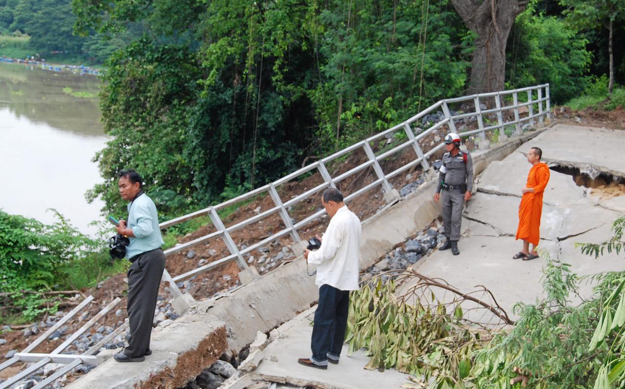 พระครูสุธีปริยัตยาทร อายุ 42 ปี เจ้าอาวาส เปิดเผยว่า แนวเขื่อนหน้าวัด มีความยาว ประมาณ 300 เมตร เมื่อ 2-3 วันที่ผ่านมา เกิดฝนตกติดต่อกัน ทำให้ถนนตามแนวเขื่อนริมตลิ่งได้ทรุดตัวลง เป็นแนวยาว กว่า 50 เมตร ลึกประมาณ 2-3 เมตร ส่วนสาเหตุ น่าจะมาจาก น้ำในแม่น้ำป่าสักลดลง และมีฝนตกต่อเนื่อง ทำให้ถนนริมเขื่อนทรุด ตัวลง และก็เกรงว่า จะทรุดตัวลงเพิ่มขึ้นอีก