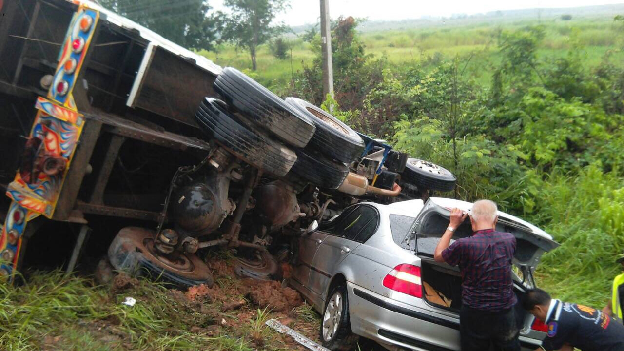 ตร.สระแก้ว รุดดูเหตุรถบรรทุกสิบล้อเสียหลัก เกี่ยวหน้ารถ BMW ก่อนพุ่งชนเสาไฟฟ้า ขณะรถพ่วงสวนเลนชนซ้ำในระยะกระชั้นชิด ลากลงข้างทาง อัดก๊อบปี้คารถเสียชีวิต 3 ศพ ตาวัย 80 ปี ไร้ของขลังรอดตายปาฏิหาริย์