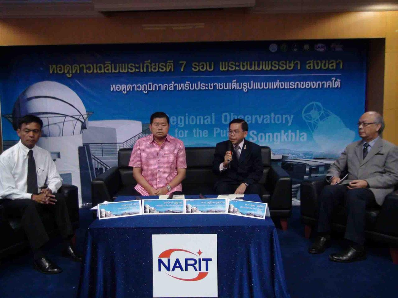 เมื่อวันที่ 15 ก.ย.2558 ที่ห้องประชุมวิเชียรคีรี ชั้น 4 องค์การบริหารส่วนจังหวัดสงขลา รศ.ดร.บุญรักษา สุนทรธรรม ผอ.สถาบันวิจัยดาราศาสตร์แห่งชาติ (องค์การมหาชน) พร้อมด้วย รศ.ดร.สุนทร โสตถิพันธ์ อธิการบดีมหาวิทยาลัยราชภัฏสงขลา นายนิพนธ์ บุญญามณี นายกองค์การบริหารส่วนจังหวัดสงขลา และนายประสงค์ บริรักษ์ นายกเทศมนตรีเมืองเขารูปช้าง อ.เมือง จ.สงขลา ร่วมกันแถลงข่าวพิธีวางศิลาฤกษ์ อาคารหอดูดาวเฉลิมพระเกียรติฯ 7 รอบพระชนมพรรษา สงขลา โดยมีสมเด็จพระเทพรัตนราชสุดาฯ เสด็จมาเป็นประธานในพิธีวางศิลาฤกษ์อาคารหอดู ดาวแห่งนี้ในวันที่ 23 กันยายน 2558 นี้