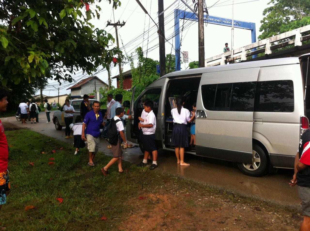 เมื่อเวลา 07.50 น. วันที่ 18 ก.ย.58 ศูนย์กู้ภัยสมาคมพุทธประทีปหลังสวน อ.หลังสวน จ.ชุมพร รับแจ้งเหตุรถตู้รับส่งนักเรียนขับฝ่าถนนที่ถูกน้ำท่วมแล้วเครื่องยนต์เกิดดับ มีนักเรียนอยู่ในรถจำนวนมากที่บริเวณใต้สะพานบ้านด่าน ริมแม่น้ำหลังสวน จึงออกช่วยเหลือพร้อมเจ้าหน้าที่ตำรวจ สภ.หลังสวน และกำลัง อส.