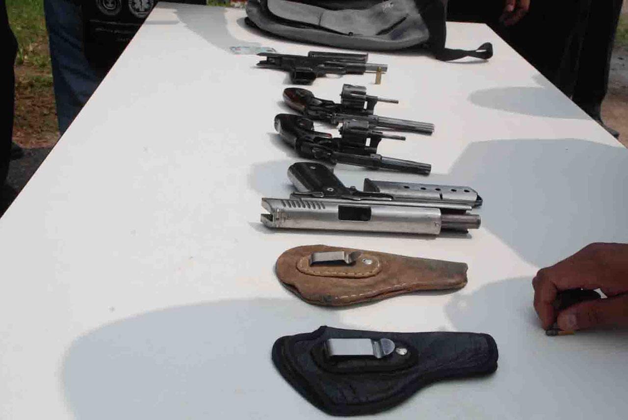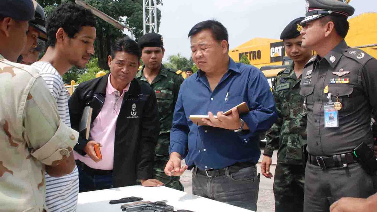 ทั้งนี้ อาวุธปืนที่ตรวจยึดได้ ประกอบด้วย อาวุธปืนพกสั้นแบบรีวอลเวอร์ ยี่ห้อสมิทแอนด์เวสสัน ขนาด.22 จำนวน 1 กระบอก อาวุธปืนพกสั้นแบบรีวอลเวอร์ ยี่ห้อสมิทแอนด์เวสสัน ขนาด.32 จำนวน 1 กระบอก อาวุธปืนพกสั้นแบบออโตเมติก สแตนเลส ชนิดไทยประดิษฐ์ ขนาด 9 มม. จำนวน 1 กระบอก และอาวุธปืนพกสั้นแบบออโตเมติก ไม่ทราบยี่ห้อ ขนาด 9 มม. จำนวน 1 กระบอก เครื่องกระสุนปืนขนาด .22 จำนวน 3 นัด ขนาด 9 มม. 1 นัด ซองกระสุนปืน 2 ซอง กระเป๋าสะพาย จำนวน 1 ใบ