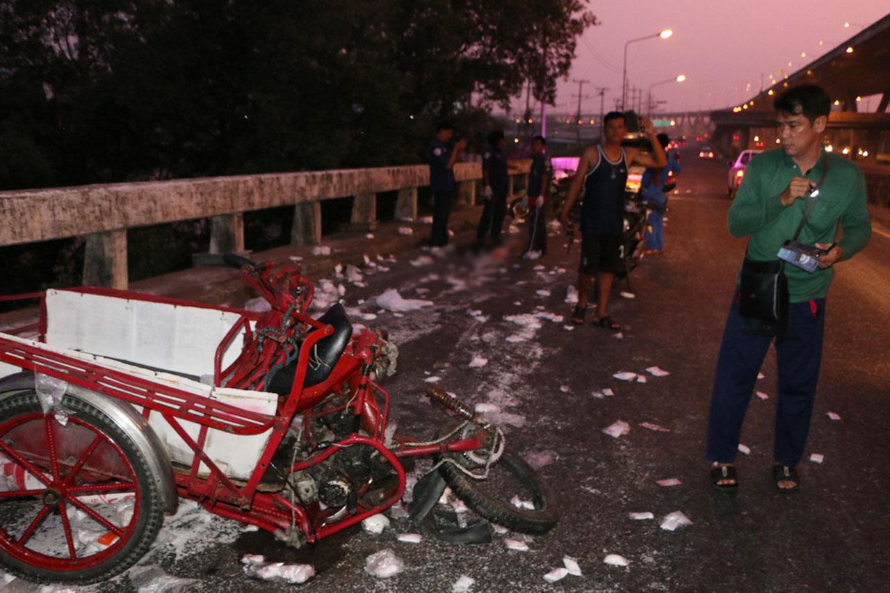 หนุ่มไทยขี่รถซาเล้งขายเกลือถึงบนสะพานข้ามแม่น้ำบางปะกง ถูกหนุ่มใหญ่ชาวเกาหลีใต้ขับรถยนต์ชนกระเด็นตายกลางถนน ท่ามกลางห่อเกลือ ส่วนคนชนขับหนีไปจอดห่าง 2 กม. อ้างคนตายสวนเลน แต่ชาวบ้านยืนยันเห็นมาทางเดียวกัน ขับชนท้ายแล้วหนี...