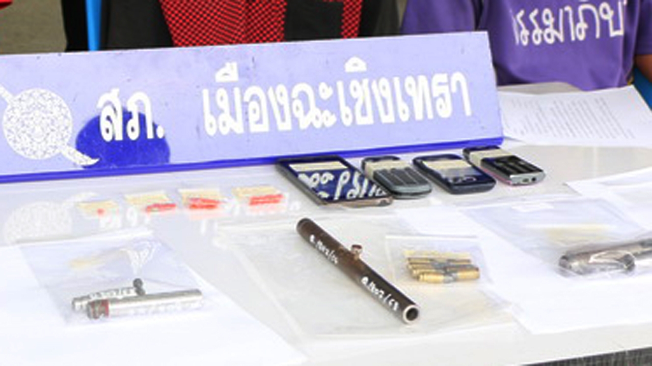 เมื่อเวลา 13.00 น. วันที่ 22 ก.ย. ที่หน้า สภ.เมืองฉะเชิงเทรา พล.ต.ต.ธีรพล จินดาหลวง ผบก.ภ.ฉะเชิงเทรา พร้อมด้วย พ.ต.อ.ธราเทพ ตูพานิช ผกก.สภ.เมืองฉะเชิงเทรา และชุดสืบสวน ร่วมกันแถลงผลการจับกุม ผู้ต้องหาแก๊งค้ายาบ้าและให้เช่าปืนปากกา รายสำคัญในพื้นที่ โดยมีวัยรุ่นอายุ 17 ปี เป็นหัวหน้าแก๊ง ร่วมกับ นายนิกฤษ หรือ แมท แตงสวัสดิ์ อายุ 25 ปี, นายกิติ หรือ เล็ก สาสมจิตต์ อายุ 23 ปี และ วัยรุ่นอายุ 17 ปี อีก 1 คน ของกลางยาบ้าจำนวน 30 เม็ด อาวุธปืนไทยประดิษฐ์ (ปืนปากกา) ขนาด 9 มม. จำนวน 2 กระบอก กระสุนปืนขนาด 9 มม. 8 นัด และรถจักรยานยนต์ ฮอนด้า เอ็มเอสเอ็กซ์ สีขาว ไม่ติดแผ่นป้ายทะเบียน 1 คัน ที่มีการแจ้งหายไว้ที่สภ.บางปะกง