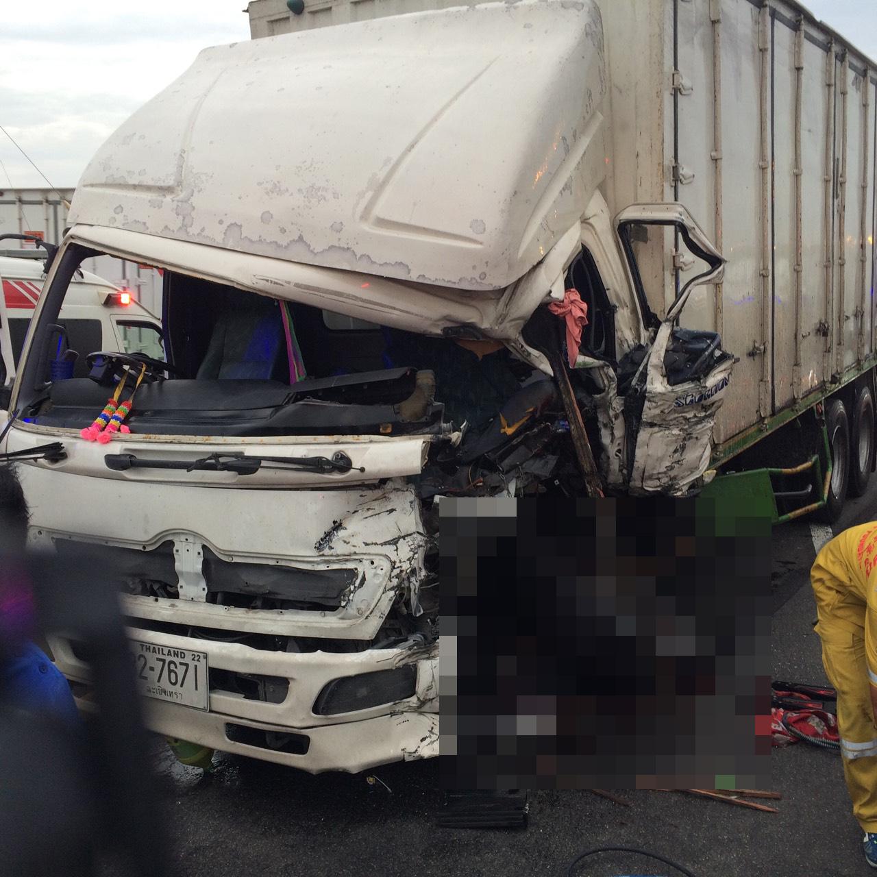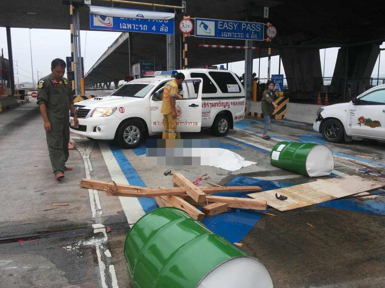 เมื่อเวลา 17.30 น. วันที่ 22 ก.ย. 58 ร.ต.ท.พงษ์นรินทร์ นนตานอก พงส.สภ.บางพลี จ.สมุทรปราการ รับแจ้งเหตุรถบรรทุก 6 ล้อ ชนท้ายรถ 6 ล้อที่บรรทุกถังน้ำมันไฮดรอลิก บนทางด่วนบูรพาวิถี กม.19 ขาออกมุ่งหน้าชลบุรี ต.บางโฉลง อ.บางพลี มีผู้ได้รับบาดเจ็บสาหัสและชีวิต จึงรายงานให้ พ.ต.อ.พัลลภ แอร่มหล้า ผกก.สภ.บางพลี ทราบ ก่อนเข้าตรวจสอบพร้อมมูลนิธิร่วมกตัญญู