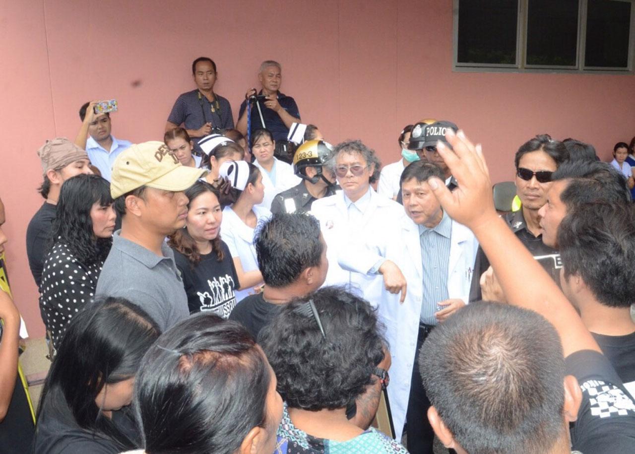 กระทั่ง ผ่านไปประมาณ 45 นาที นพ.เลิศศักดิ์ โตสิงห์ แพทย์เจ้าของไข้ ได้เดินออกมาพบกลุ่มชาวบ้าน และได้พยายามอธิบาย แต่เหตุการณ์กับวุ่นวายขึ้นอย่างต่อเนื่อง เมื่อชาวบ้านบางรายที่ไม่พอใจ พยายามกรูเข้าหา นพ.เลิศศักดิ์ จนเกิดเหตุชุลมุนขึ้น แต่ก็มีบางส่วนที่ขวางไว้ ท่ามกลางการดูแลความปลอดภัยของเจ้าหน้าที่ตำรวจ สภ.เมืองกาญจนบุรี