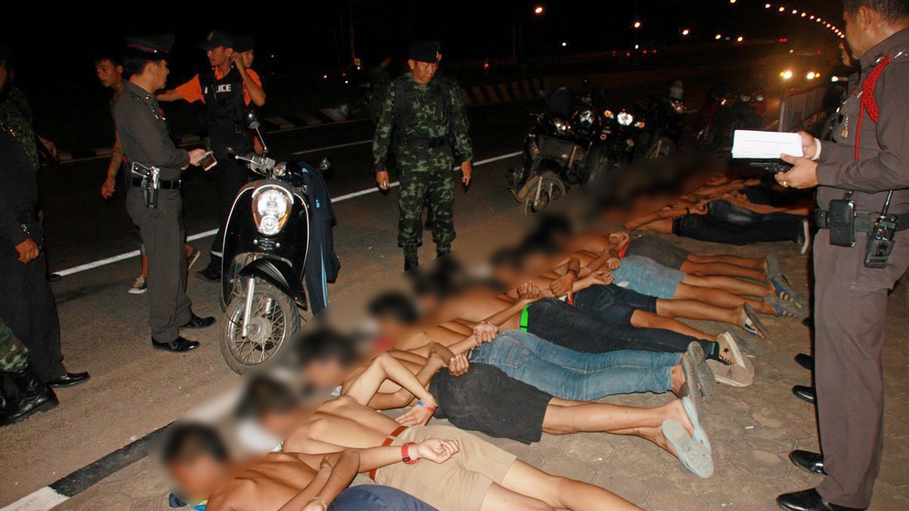 พบเด็กวันรุ่นขี่รถ จยย.มาจากฝั่งในเมืองเป็นกลุ่มประมาณกว่า 20 คัน จึงสกัดจับไว้ได้ทั้งหมดเป็นชายจำนวน 32 คน และเป็นหญิงที่ซ้อนท้ายมาอีก 6 คน อายุ 14-19 ปี เจ้าหน้าที่ให้วัยรุ่นชายถอดเสื้อพบว่าบางคนมีรอยสักเต็มตัว บางคนก็สักบางส่วน วัยรุ่นที่สักยันต์จะเป็นรุ่นพี่ที่ไม่ได้เรียนหนังสือ แต่เด็กบางส่วนยังเรียนหนังสือระดับ ม.2-4 บางคนยังนุ่งกางเกงนักเรียนสีกากีมาด้วย ตรวจค้นไม่พบอาวุธ พบเพียงปืนแก๊ปซุกซ่อนใต้เบาะรถ 1 กระบอก ตรวจปัสสาวะพบว่ามีสีม่วง 4-5 ราย ผู้ที่ถูกตรวจพบยอมรับว่าเสพยาบ้า เจ้าหน้าที่ได้ถ่ายรูปทำประวัติไว้ทุกคน ส่วนบรรดาวัยรุ่นเด็กแว้นรุ่นเล็กบอกว่าตามรุ่นพี่มา แต่ไม่รู้ว่าจะไปไหน รุ่นพี่ชวนก็มาด้วย นำตัวไปที่สถานีตำรวจติดต่อให้ผู้ปกครองมารับกลับบ้านต่อไป.