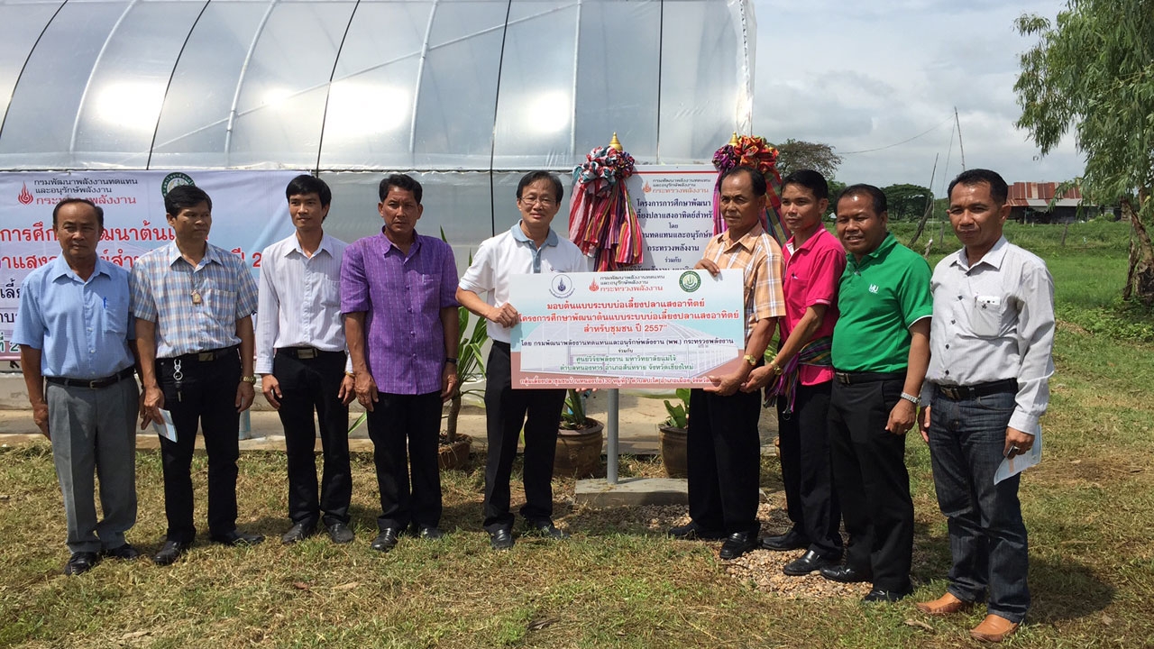 ซึ่งอุณหภูมิที่เหมาะสมในการเลี้ยงปลาอยู่ที่ 28-32 องศาเซลเซียส โดยทำการศึกษามาตั้งแต่ปี 2555 และขยายโครงการในปี 2557 ดำเนินการนำร่องแล้ว 3 แห่ง คือ ที่ อ.แม่แตง จ.เชียงใหม่, อ.เมืองเลย และ อ.เมืองหนองคาย แห่งนี้ โดยกรมฯเป็นผู้สนับสนุนงบประมาณในการจัดสร้างโรงเรือนขนาดกว้าง 7.5 เมตร ยาว 18 เมตร มีบ่อขนาด 5 คูณ 5 เมตร 3 บ่อ มูลค่า 180,000 บาท เกษตรกรใช้เลี้ยงปลาดุกอุย ปลานิล และกบ มีระบบพัดลมระบายอากาศ โครงหลังคาใส