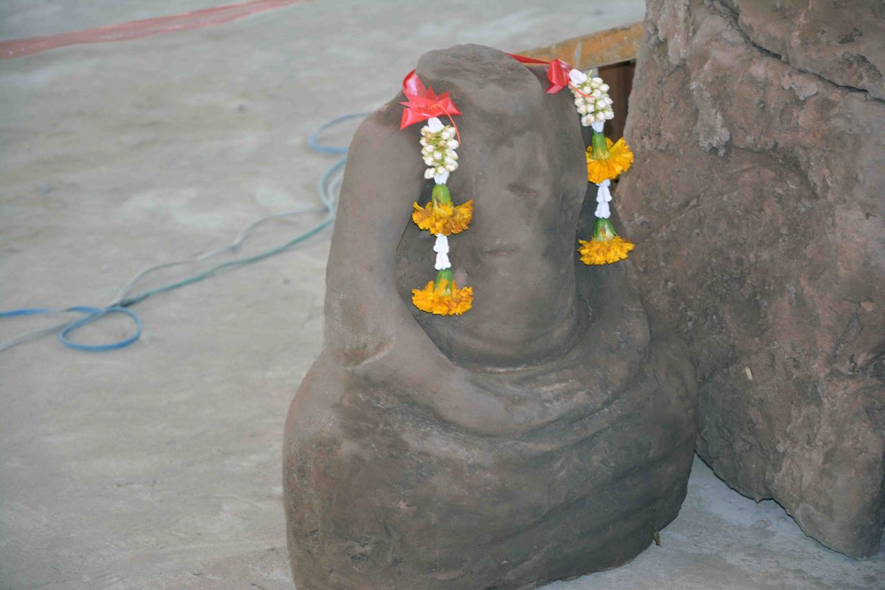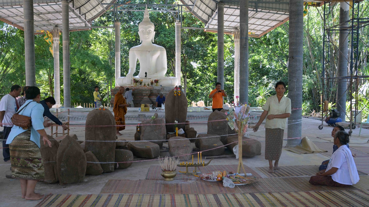"ต่อมาปี 2558 ได้มีโครงการสร้างศาลาการเปรียญสำหรับสวดมนต์และนั่งวิปัสสนา จึงได้ชวนชาวบ้านสร้างศาลาโดยที่ไม่มีเงินทุน ได้อาศัยเงินทำบุญจากชาวบ้านก่อสร้างศาลาไปเรื่อยๆ และต่อมาได้มีนายสุรศักดิ์ ซึ่งเป็นช่างปั้นและวาดลวดลายกระเบื้อง มาทำงานนอนอยู่ที่วัด ได้ฝันเห็นใบเสมาเมื่อวันที่ 25 กันยายนที่ผ่านมาจึงพากันไปขุดดู และพบใบเสมากับพระพุทธจำนวนมาก จึงได้แจ้งผู้ใหญ่บ้าน เมื่อชาวบ้านทราบข่าวก็มาช่วยกันขุด และพบขึ้นมาอีก ซึ่งทางวัดและผู้ใหญ่บ้าน ได้แจ้งกับกรมศิลปากรไปแล้ว" เจ้าอาวาส กล่าว