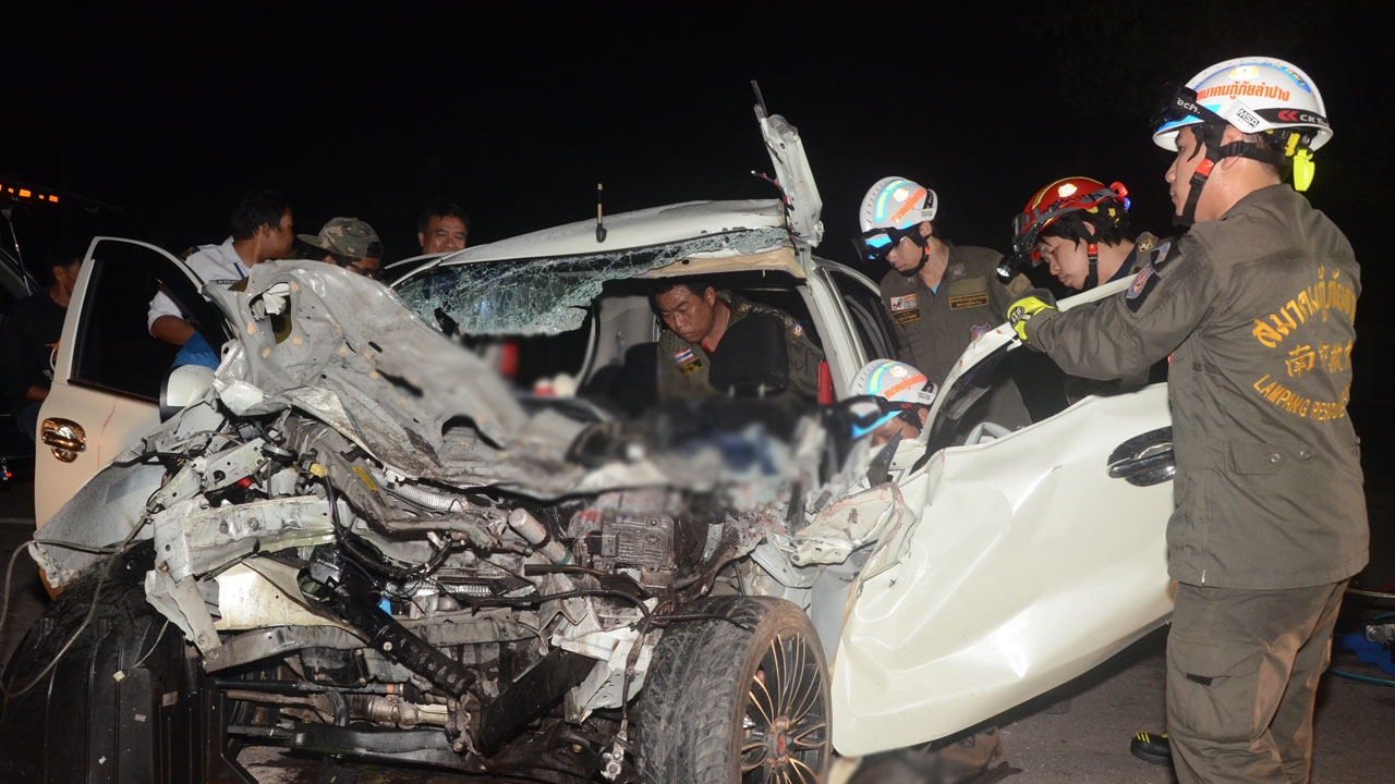 3 หนุ่ม นศ.ราชมงคลล้านนา ลำปาง กลับจากเที่ยวสถานบันเทิง ซิ่งเก๋งชนท้ายรถบรรทุกปูนซีเมนต์ 18 ล้อ รถพังยับ ตายคาซากรถ 2 คน ส่วนคนขับสาหัส ตร.คาด อาจหลับในหรือเมาสุรา
